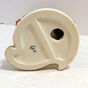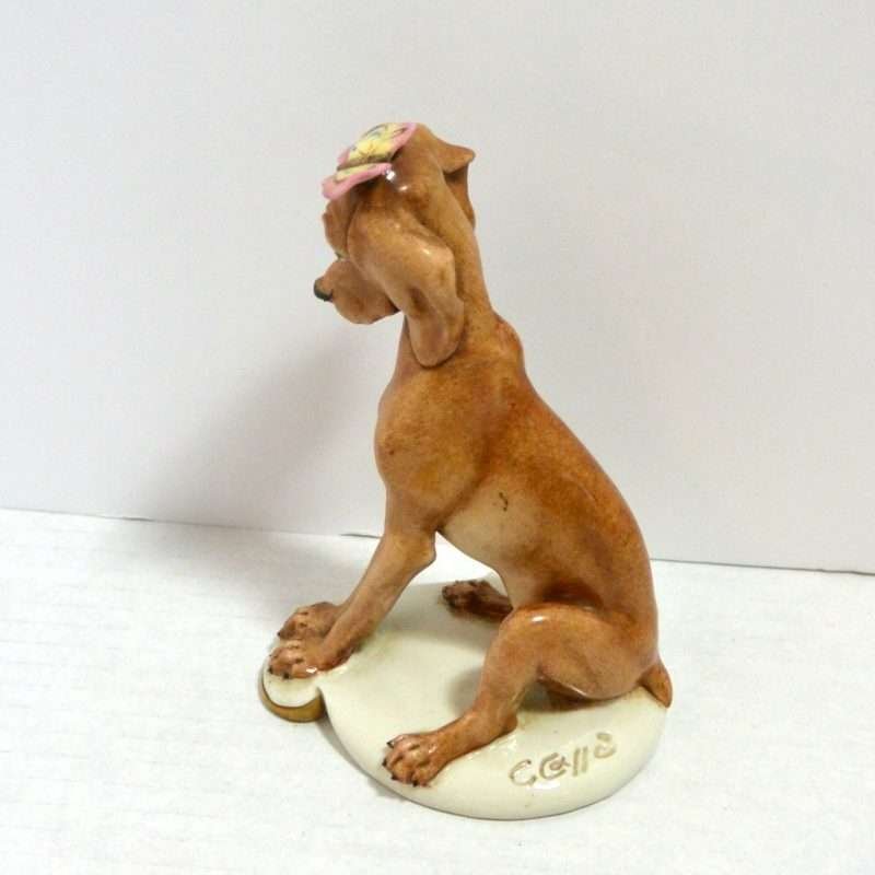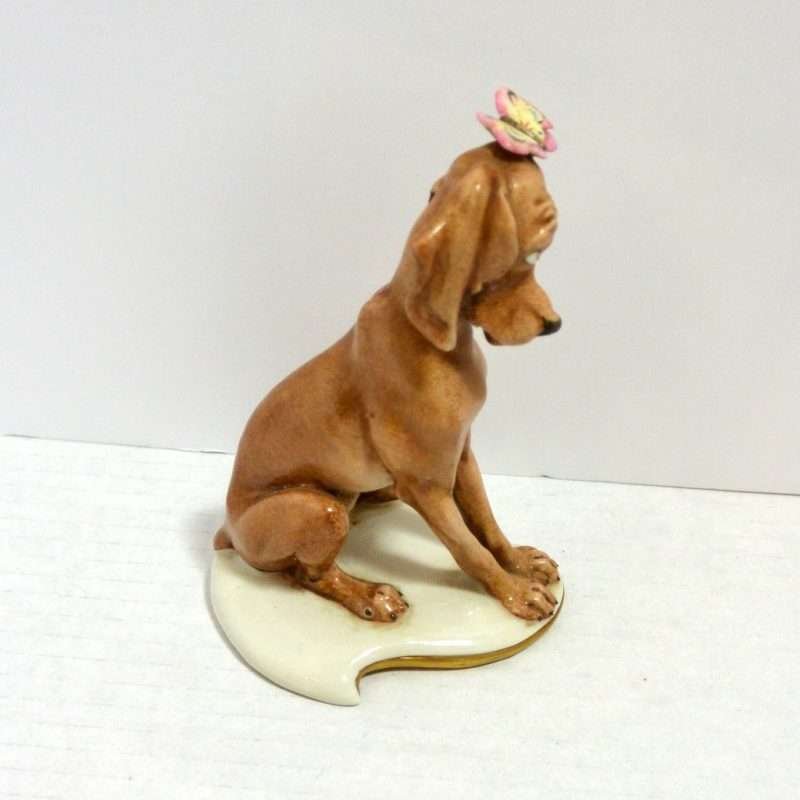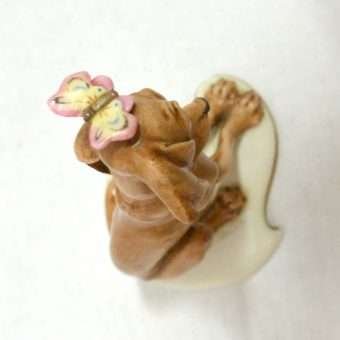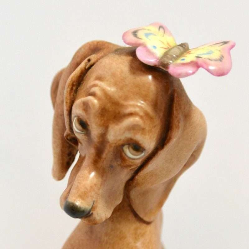 This engaging, porcelain dog was sculpted and signed by Guiseppe Cappe for the Capodimonte factory in Italy c. 1950’s – 1980’s. She looks like she could be a Weimaraner with her large paws and drooping ears. She is in excellent condition sitting at 4 3/4″ tall x 3 1/4″ long x 3″ wide. Her shy, flirty, expression fits well with the butterfly perched above one ear, almost as though it was meant to be a stylish adornment. Dog figurines from the Capodimonte factories are always uniquely animated and such fun to collect! More than just a figurine to be cherished, they each seem to have their own very special story to tell.