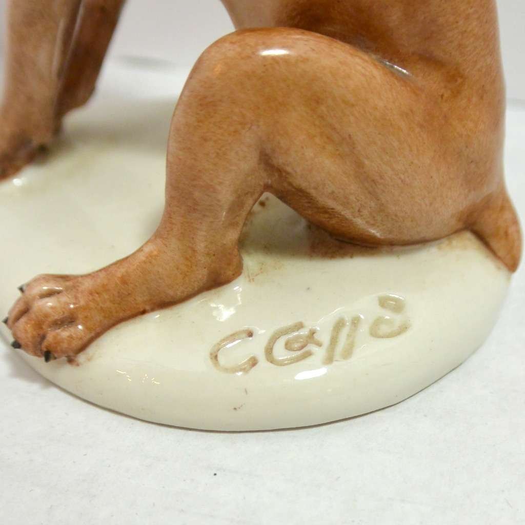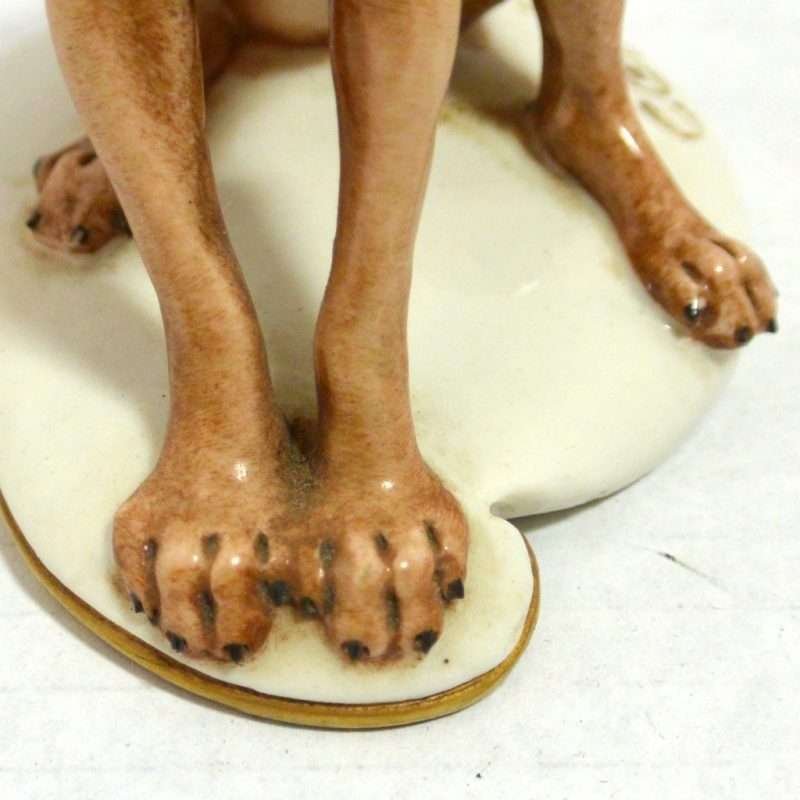 This engaging, porcelain dog was sculpted and signed by Guiseppe Cappe for the Capodimonte factory in Italy c. 1950’s – 1980’s. She looks like she could be a Weimaraner with her large paws and drooping ears.