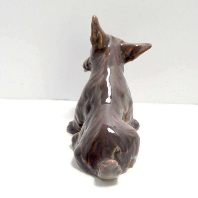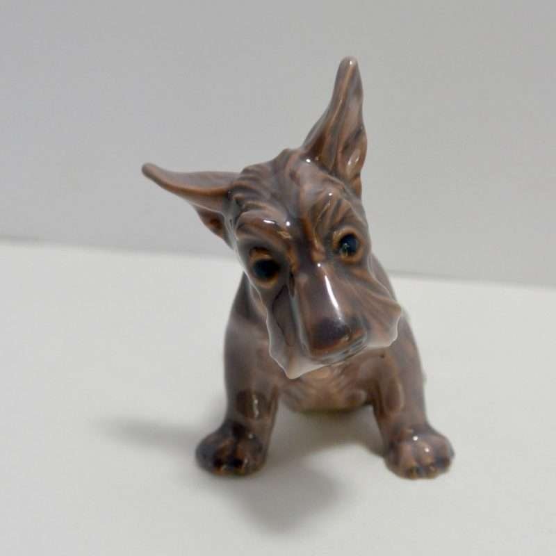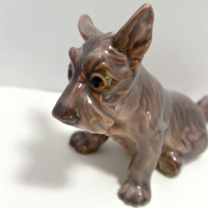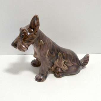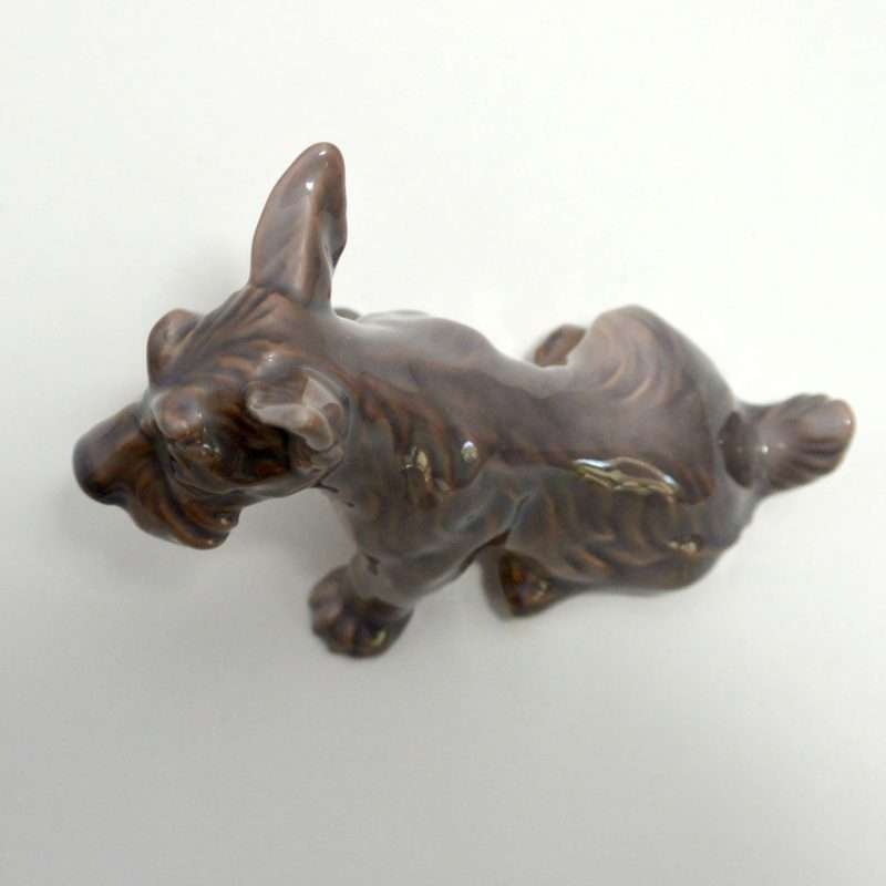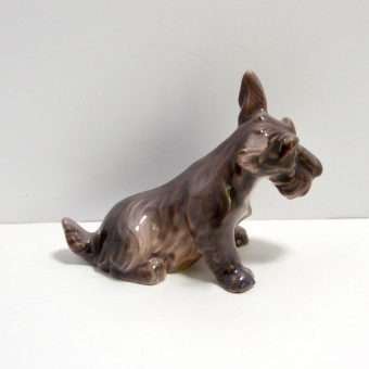 This Scottish Terrier pup by Dahl Jensen is absolutely exquisite! As with all Dahl Jensen figurines, his expression is so gentle and sweet, you can’t help but want to hold him! He sits 3″ tall x 3 3/4″ long x 2″ wide and looks at you with such soulful eyes, that you can almost feel your heart melting. He is clearly marked #1094 and he is in excellent condition. The white spots you may see in the pictures are just “tricks” of lighting and the camera…he is flawless. Please note that the pictures make him look more “brown” in color than he actually is. His true coloring is more of a soft grayish brown. If you are a collector of Dahl Jensen figurines, this little beauty is the perfect addition to your collection. As a gift, or a decorative reminder of your favorite breed, he is priceless!