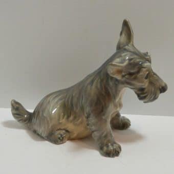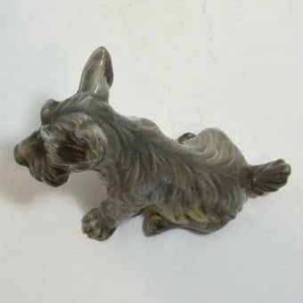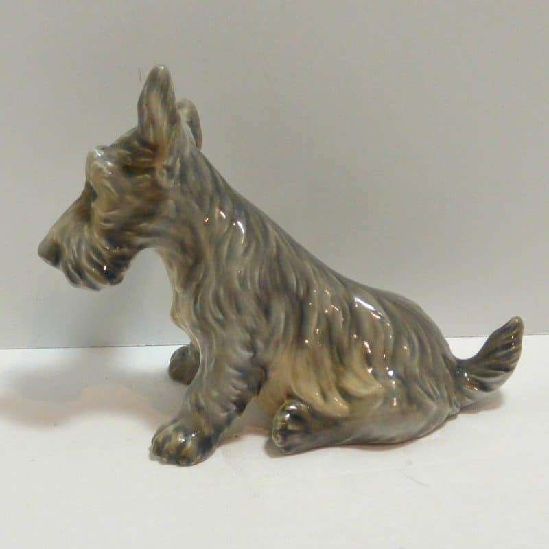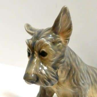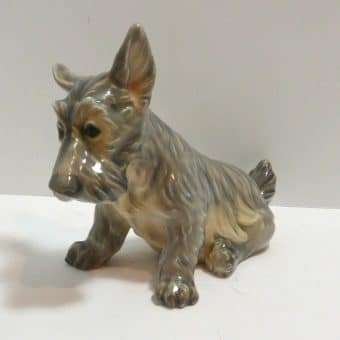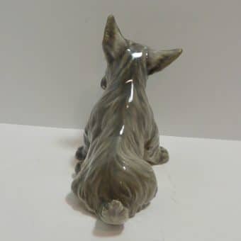 This Scottish Terrier pup by Dahl Jensen is absolutely exquisite! As with all Dahl Jensen figurines, his expression is so gentle and sweet, you can’t help but want to hold him! He sits a full 6″ tall x 8″ long x 3 3/4″ wide and looks at you with such soulful eyes, that you can almost feel your heart melting. He is clearly marked #1078 and he is in excellent condition. The white spots you may see in the pictures are just “tricks” of lighting and the camera…he is flawless. Please note that the pictures make him look more “brown” in color than he actually is. His true coloring is more of a soft grayish brown. If you are a collector of Dahl Jensen figurines, this beautiful Scottish Terrier is the perfect addition to your collection. He appears on page 37 of “Dahl-Jensen Porcelain Figurines 1897-1985 by Caroline and Nick Pope. As a gift, or a decorative reminder of your favorite breed, he is priceless!