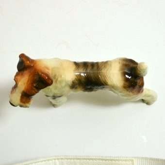 This beautifully detailed Wire-Haired Fox Terrier was created by the National Potteries Corporation (NAPCO) of Bedford, Ohio. This company became known for its consistently well-designed work in both porcelain and glass, and was quite popular throughout the 1950’s and 1960’s.It has since regained its popularity, mostly due to the intricate detailing and beauty of its designs, as well as the affordability of its pieces as collectibles. This standing dog seems to exude confidence, with the focused and determined look that is typical for this intelligent and independent breed. He is meticulously hand-painted, and he is is excellent condition. He stands 5″ tall x 4 1/2″ long x 1 3/4″ wide. He would look wonderful on a desk or grouped with a mix of other dogs, in various mediums. Our last picture shows him with a sitting Wire-Haired Fox Terrier, also a NAPCO, and they look fantastic together!