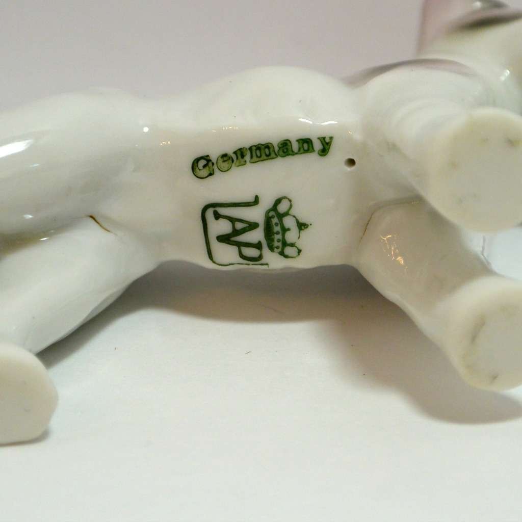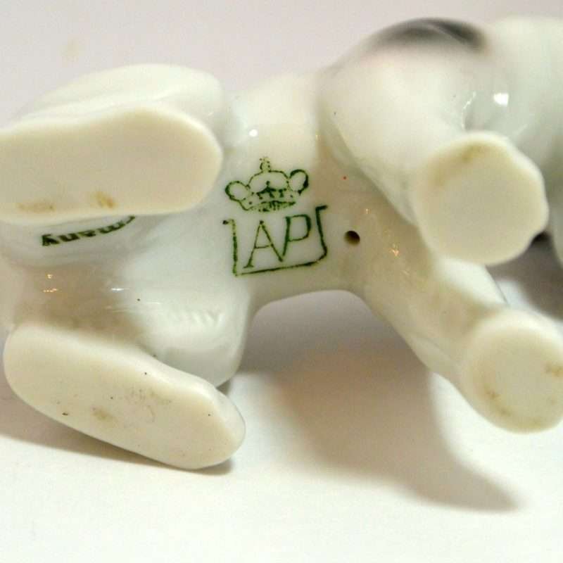 This pair of Wire-Haired Fox Terriers are in mint condition and so engaging! They have been together for so long, we thought that they should stay that way. They were created in the Mann & Porzellius Factory in Unterweissbach, Thuringia, Gemany between 1909 and 1936. They are both clearly marked “AP” (A. Porzellius) with a crown, and “Germany”, which could, in fact, date them as far back as 1882. The standing pup is 2 1/2″ tall x 3″ long x 1″ wide and the other pup sits at 2 1/2″ tall x 3″ long x 1 1/2″ wide. Together they make a perfectly matched and adorable pair.