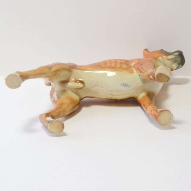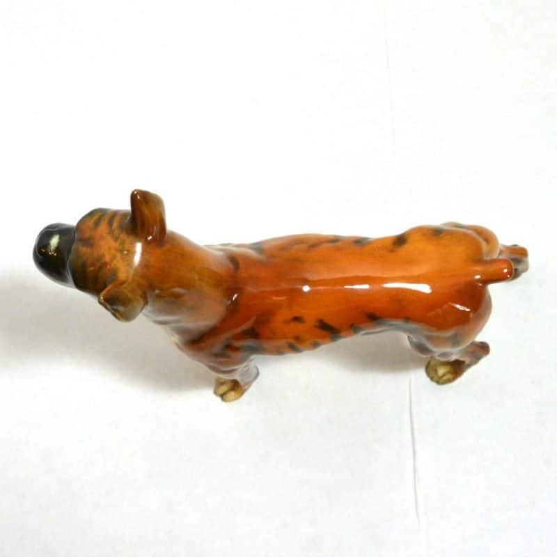Standing alert and poised for action, this Goebel Boxer dog figurine is a full 7″ tall x 7″ long x 2″ wide.