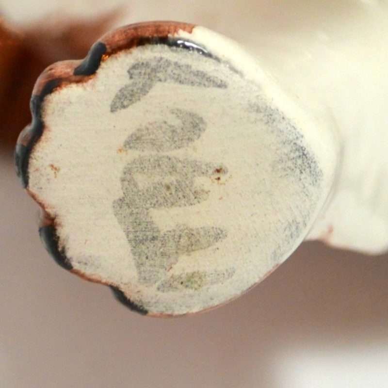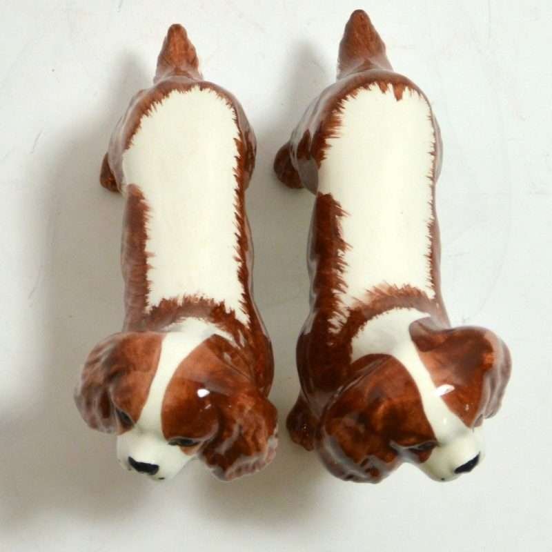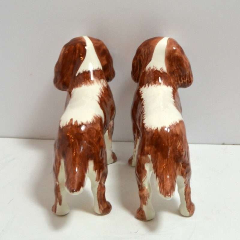 This beautiful, matched pair of Cavalier King Charles Spaniels are the perfect gift for any owner of this precious breed. Handpainted to show off their classic “Blenneim” coloring, they are done in a rich chestnut and pearly white. They stand 5″ tall x 7″ long x 2″ wide, and they are in excellent condition. They look wonderful displayed together, but we have displayed them on either side of a stack of books and they look like they were always meant to be there. Stagger them on either side of a flower pot, or together on an end table. With such sweet expressions and lovely detailing, they will look wonderful wherever you choose to place them!