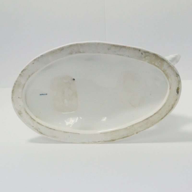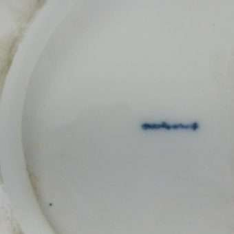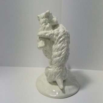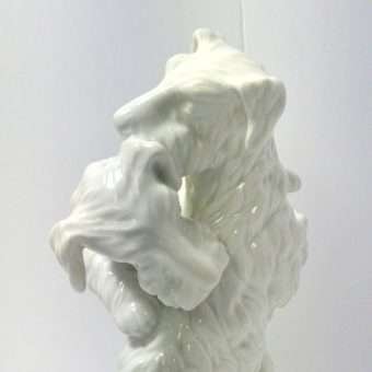 It is a large and quite heavy, Art Deco piece, standing a full 11 1/2″ tall x 11″ long x 7″ wide, and it is in excellent condition. It was created by the KPM Porcelain Decorating Workshop of Copenhagen c. 1930’s. It is marked on the underside of the base with the blue scepter mark. This Blanc de Chine porcelain will be a wonderful focal point of any room. And although it is all white, the detailing is extraordinary.