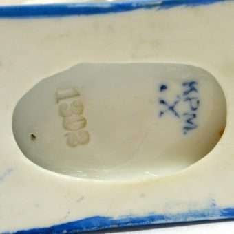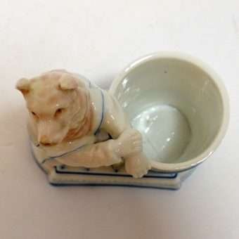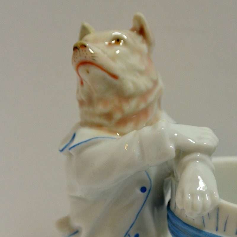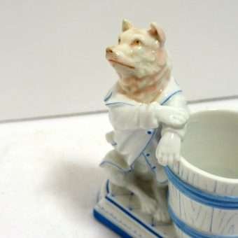 This very unique, German, porcelain match holder was made and hand painted in Germany. It features a highly-detailed dog that looks to be either an Akita, or a Shepherd, dressed in a young boy’s white dress shirt with blue trim and buttons. He sits on a cushioned platform, with his front paws crossed on the top edge of a barrel, which serves as the match holder. This wonderfully engaging porcelain piece is 4 1/4″ tall x 3 1/2″ long x 2″ wide and it is in excellent condition. It is marked “KPM” on the underside, but it is not KPM-Berlin, but rather the A. W. FR. Kister factory of Thuringia, Germany, and the blue mark places its manufacture between 1887 – 1905. This elegant piece has tremendous charm and can certainly be re-purposed for use on a vanity table, or on a formal writing desk. As a collector’s piece, it is certainly a rare and beautiful find.