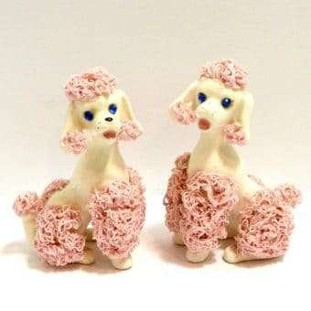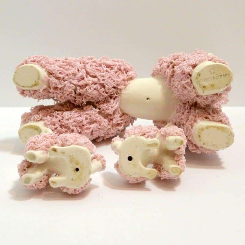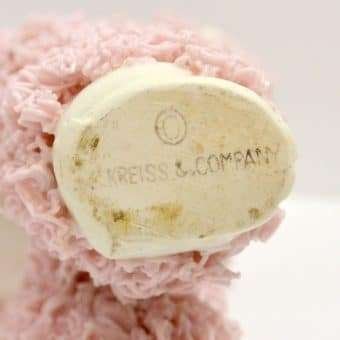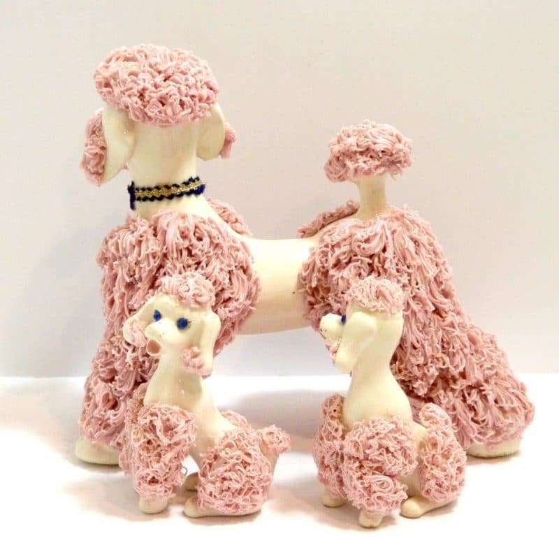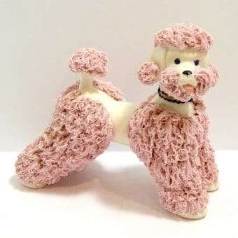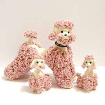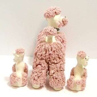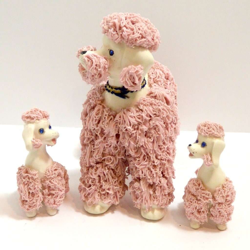 This elegant, mid-century trio is a spaghetti poodle collector’s dream. All three are in excellent condition, done in soft pink “spaghetti curls”, with snowy white bodies, and sparkling blue glass eyes.