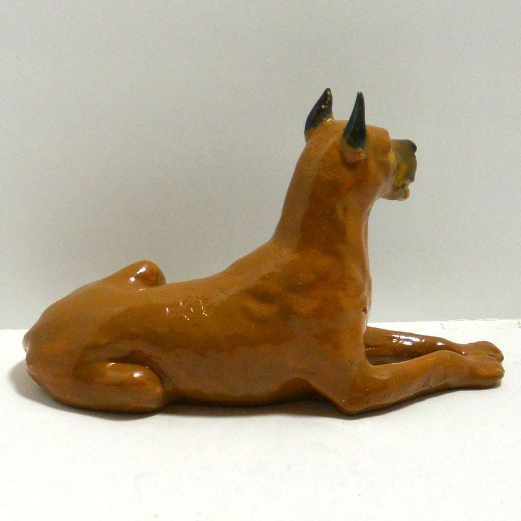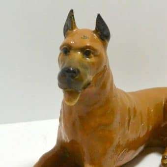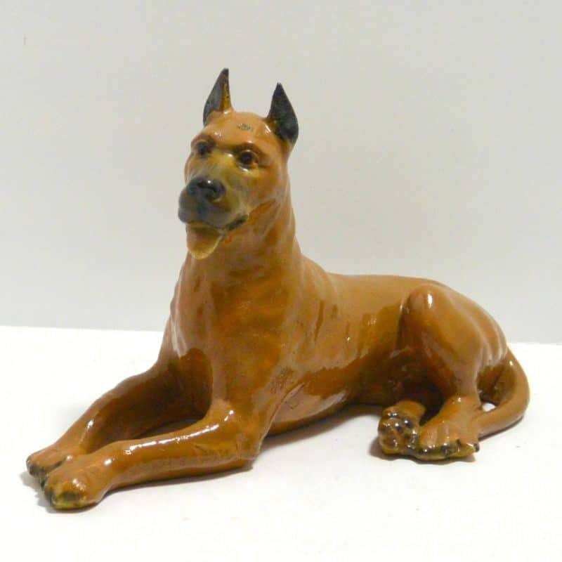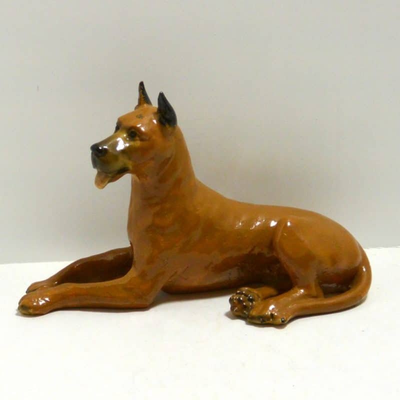 Of all the wonderful dog figurines done by Mortens Studio, this black Great Dane figurine is one of its’ most popular. This fabulous dog is reclining, with what almost looks like a grin on his face, and his tongue hanging out.