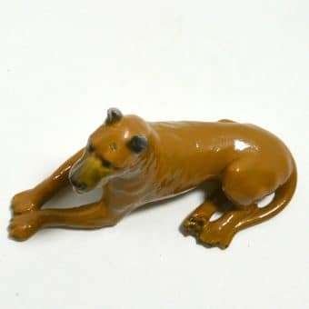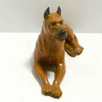 His overall, sleek, fawn painted coat is accented by a soft black muzzle, and ears. Measuring a full 5 1/4″ tall x 8 1/2″ long x 4″ wide, he is in great condition, with the exception of a spot of paint loss on the top of his head, and a rough spot on the lowest part of his chest (close to the underside of the dog.)