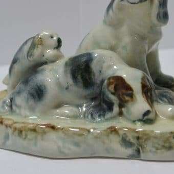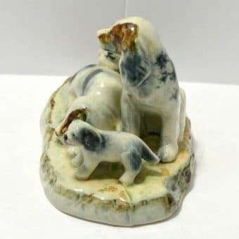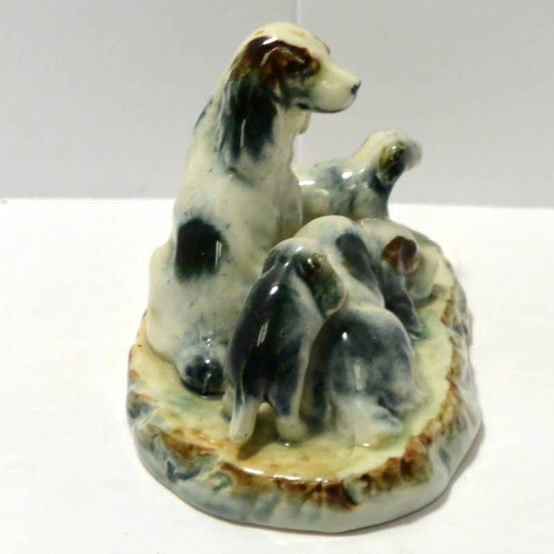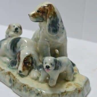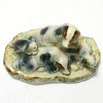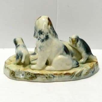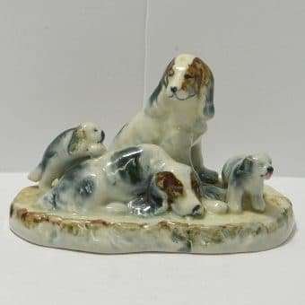 This family group of spaniel dogs, made in occupied Japan, are so beautiful. As the father dog sits guarding his family, the mother seems to be trying to take a much needed nap. Of course at least one of the two puppies isn’t going to let that happen.