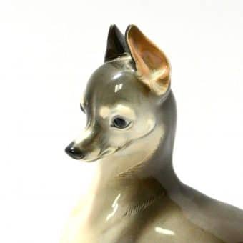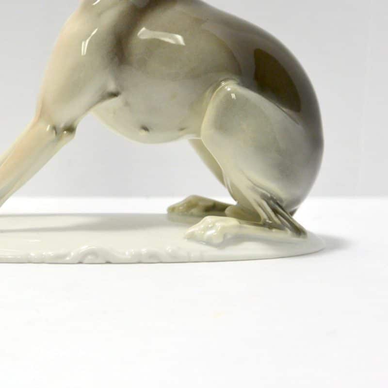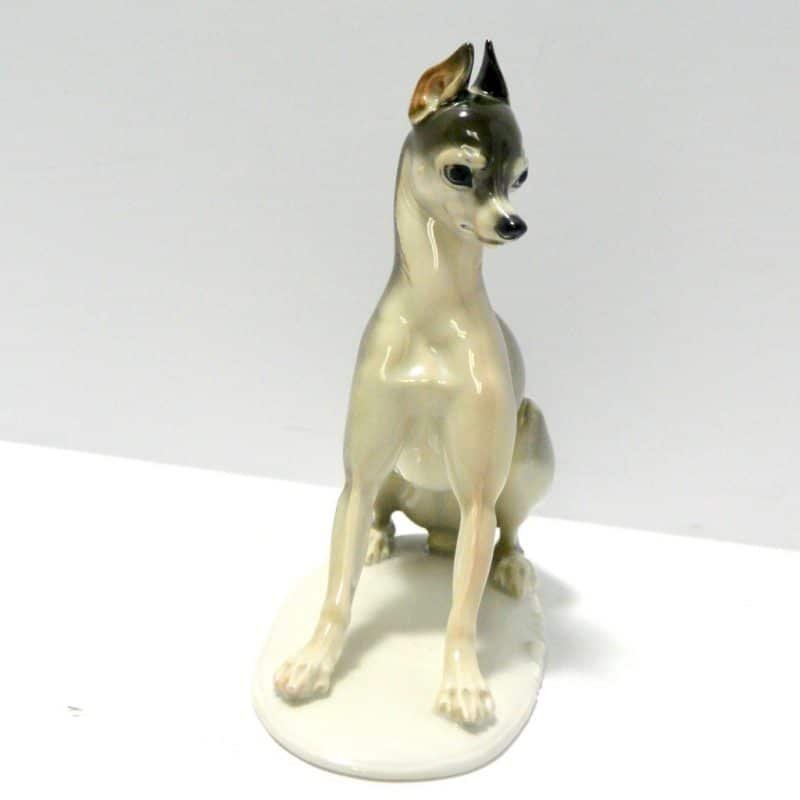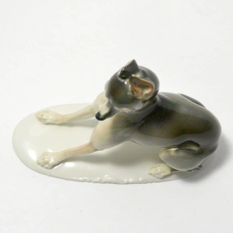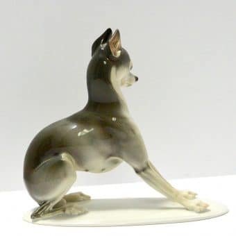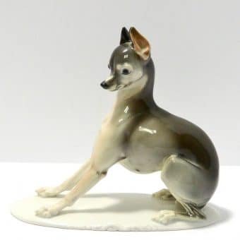 This porcelain figurine by Rosenthal, depicts an Italian Greyhound, sitting poised and alert to something directly in her path. She was designed by Prof. Theodor Karner in the early 1930’s.