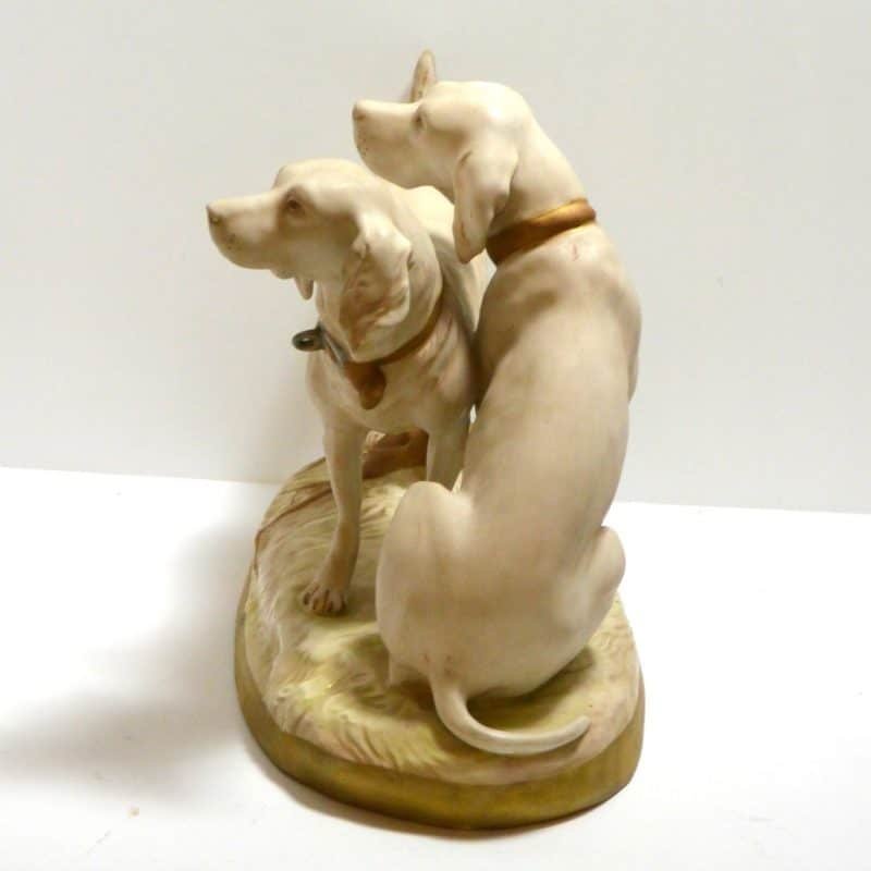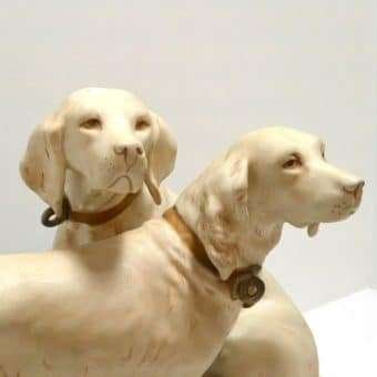 This wonderful figurine depicts a pair of hunting dogs. One is a Setter and the other is a Pointer. It is exquisitely detailed. The Setter dog has an abundance of fur lines and a beautifully feathered tail.