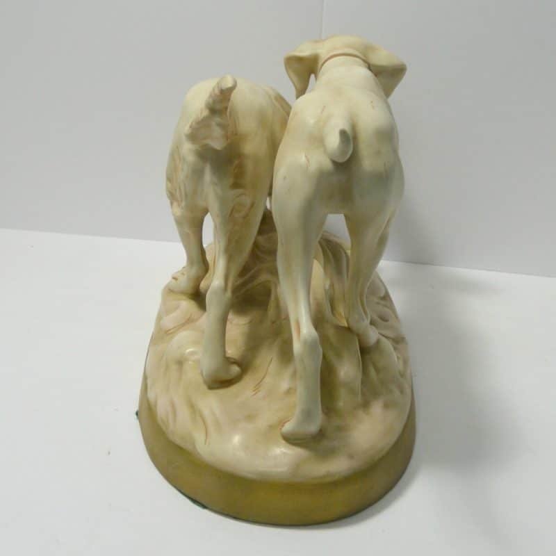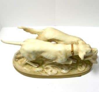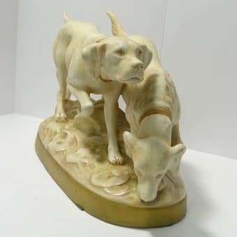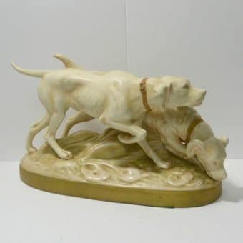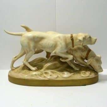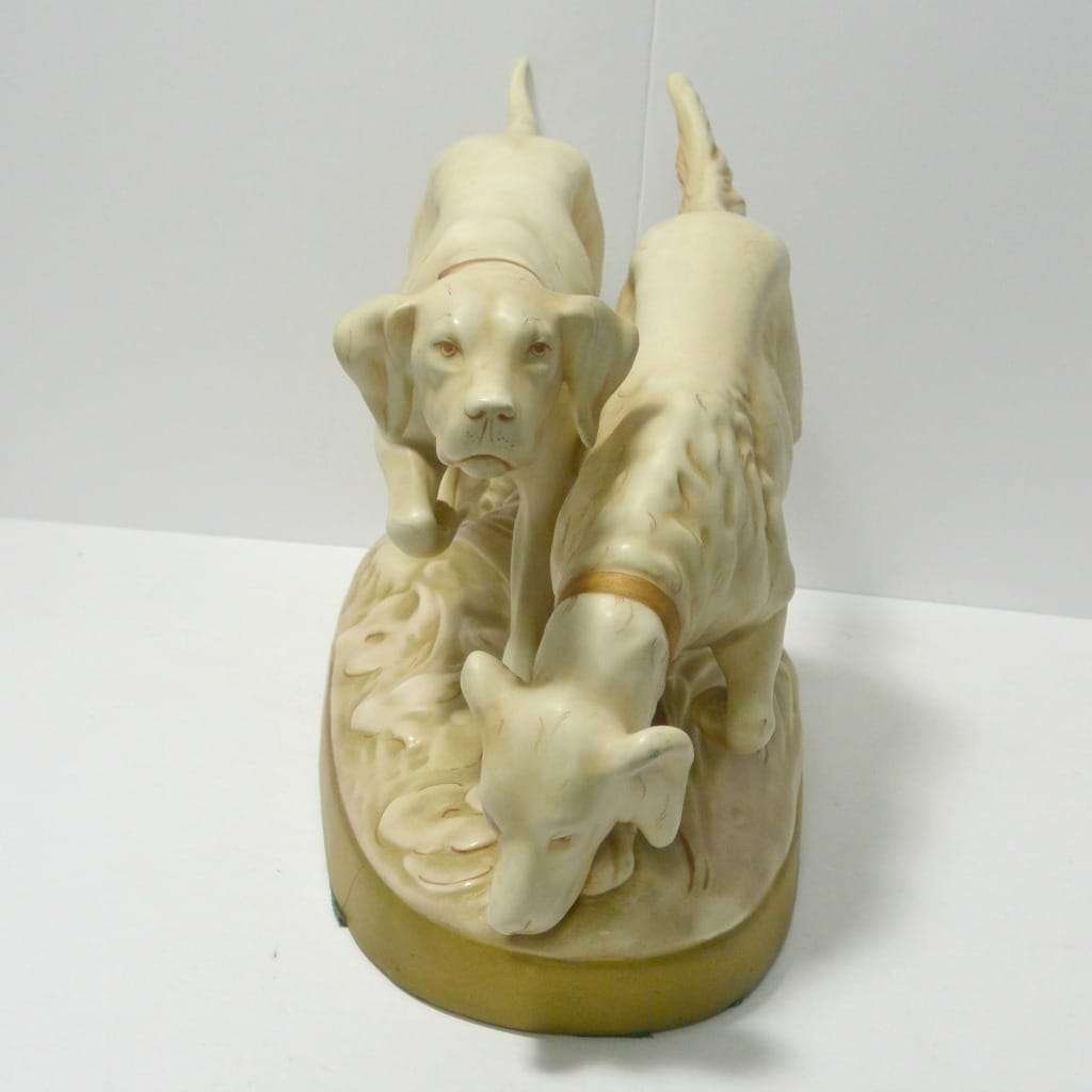 This wonderful figurine depicts a pair of hunting dogs. One is a Setter and the other is a Pointer. Both look quite intent on the task at hand.