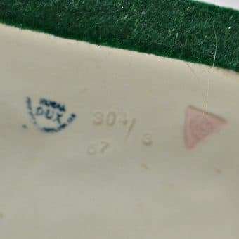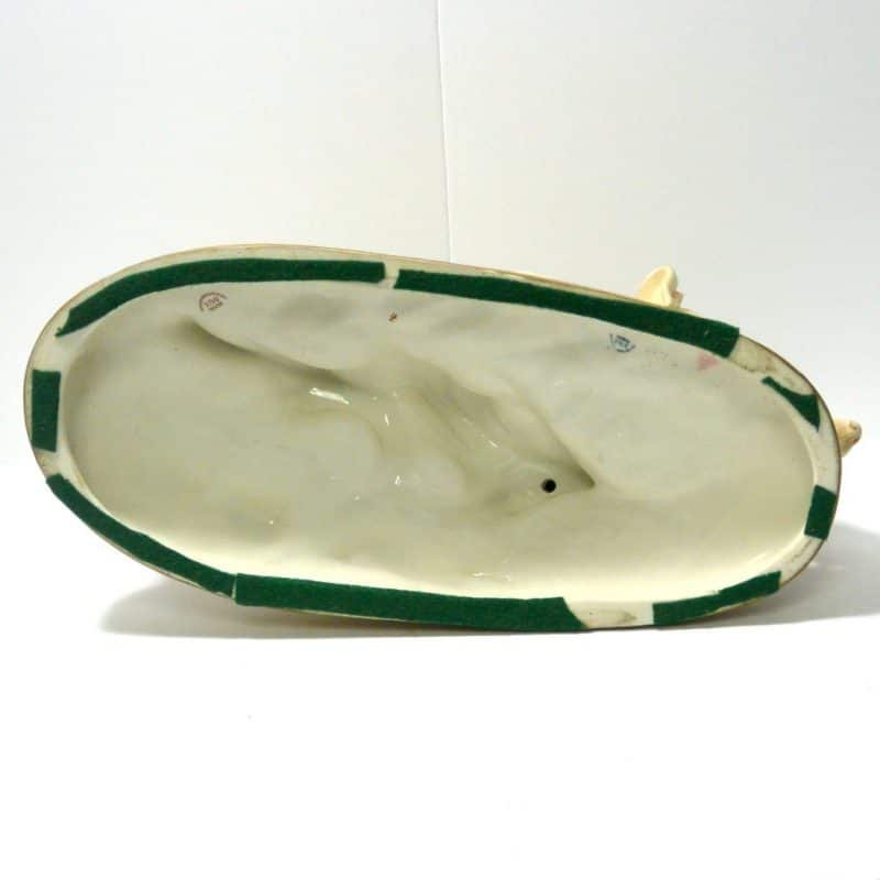 This wonderful figurine depicts a pair of hunting dogs. One is a Setter and the other is a Pointer. Both look quite intent on the task at hand. It is a large figurine, measuring a full 16″ long x 7.5″ wide x 10″ tall. It is well marked on it’s underside, including the Royal Dux pink triangle. It is exquisitely detailed. The Setter dog has an abundance of fur lines and a beautifully feathered tail. The Pointer, shows off his lean, muscled form to perfection, and his calm and focused expression is extraordinary. They are on a naturalistic-looking base with swirls of leaves and underbrush. This figurine is in excellent, flawless condition. It is hand-painted in soft shades of moss green, cream, with touches of gold. This piece would look extraordinary on a mantle, or on a sideboard in a formal dining room. It would also blend well into an office or a den. Wherever it is placed, its combination of movement and grace, will surely make it the focal point of the room.