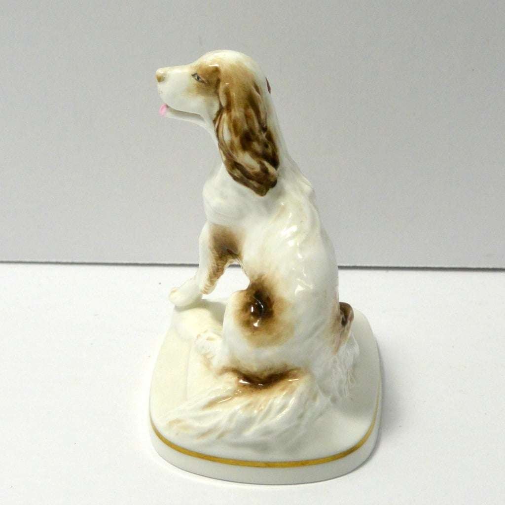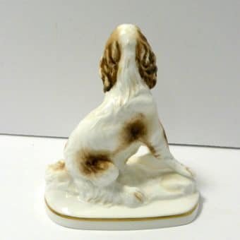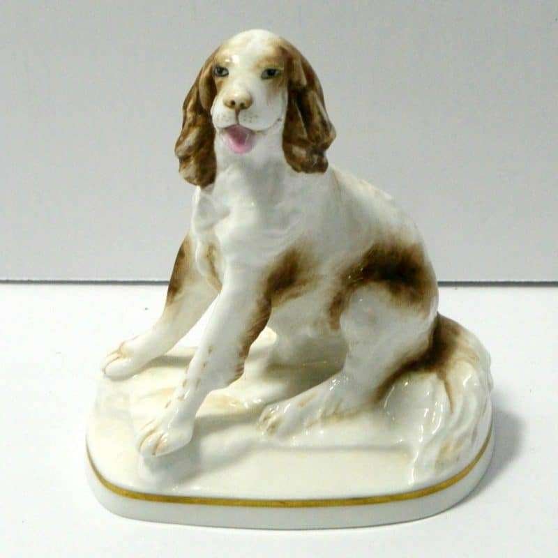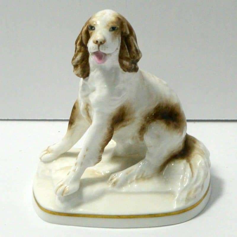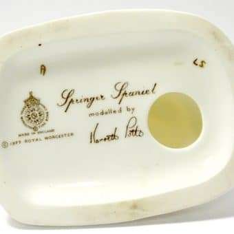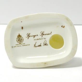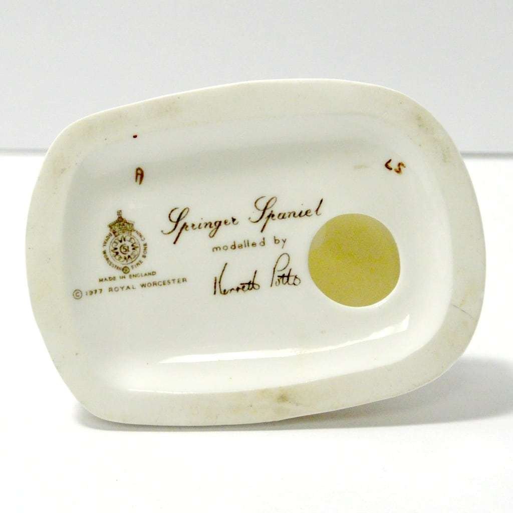 This sweet vintage, porcelain figurine of a seated Springer Spaniel dog was modelled by Kenneth Potts for Royal Worchester. Measuring 3 3/4″ tall x 3 1/4″ long x 2 1/4″ wide, he is in mint condition. He is marked to the base with the Royal Worchester gold mark and is also signed by Kenneth Potts. He is done in a bright white with liver ears and spots, and a pale pink tongue.