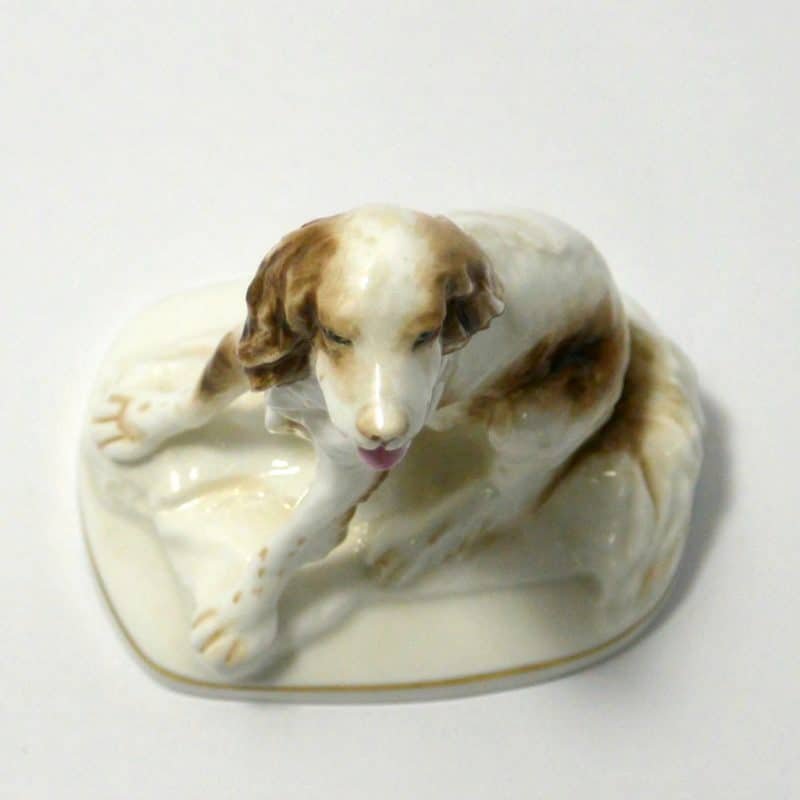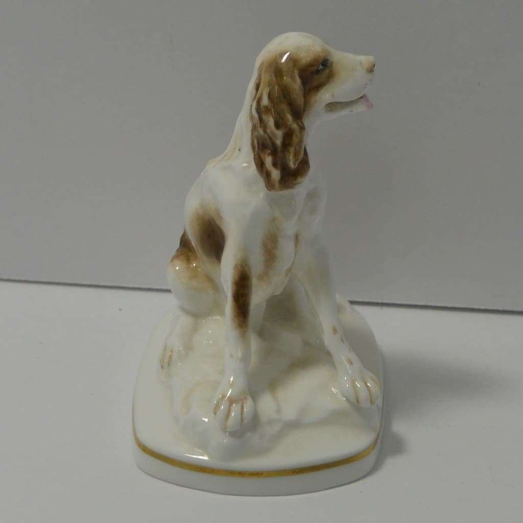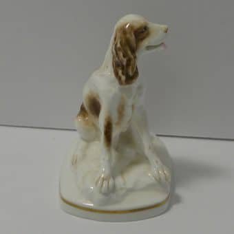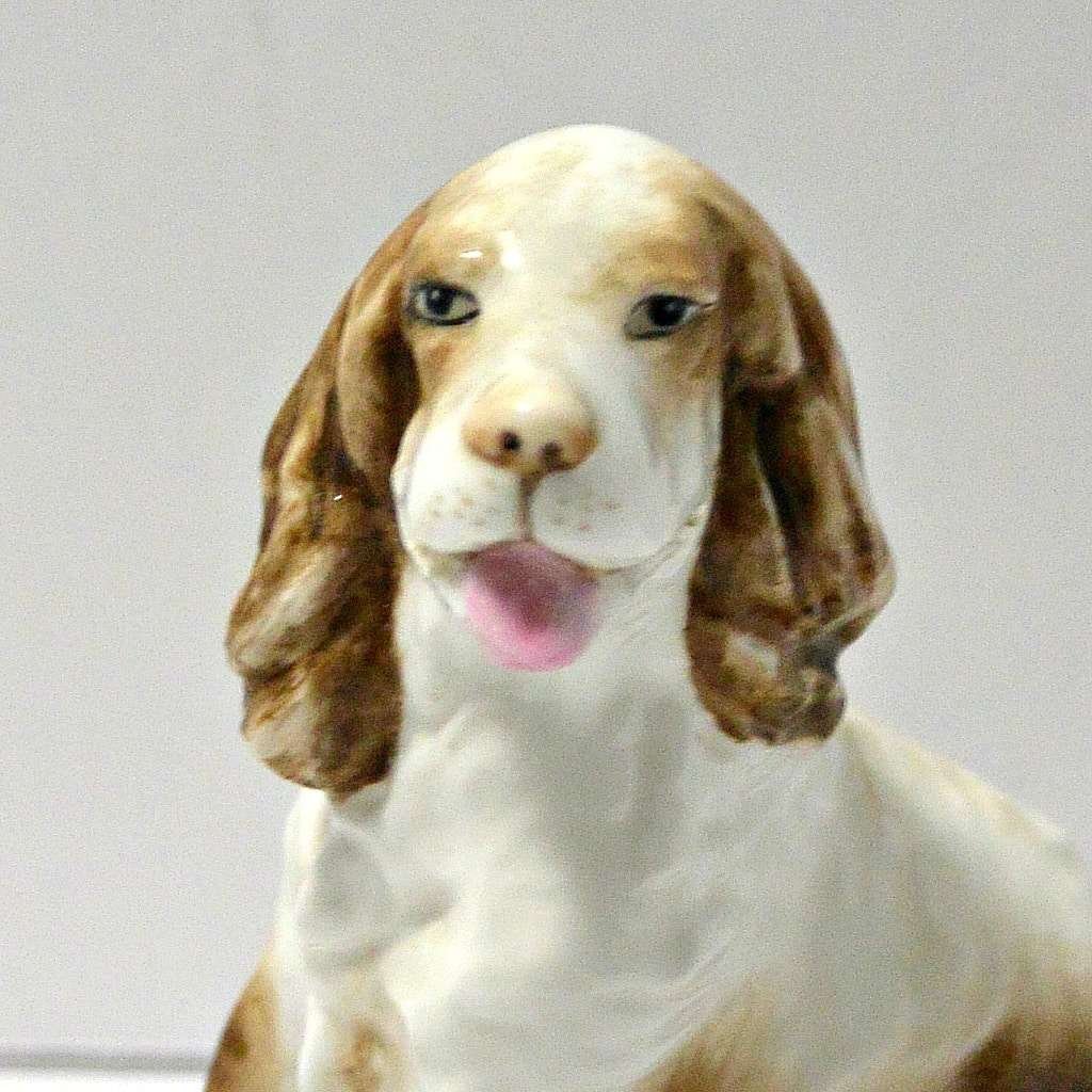 This sweet vintage, porcelain figurine of a seated Springer Spaniel dog was modelled by Kenneth Potts for Royal Worchester. Measuring 3 3/4″ tall x 3 1/4″ long x 2 1/4″ wide, he is in mint condition. He is marked to the base with the Royal Worchester gold mark and is also signed by Kenneth Potts. He is done in a bright white with liver ears and spots, and a pale pink tongue.