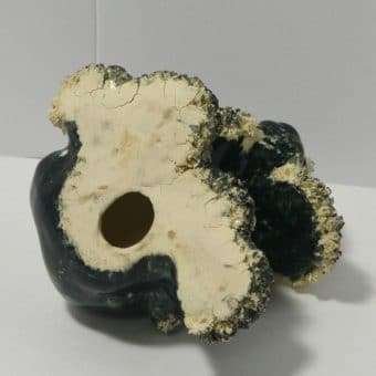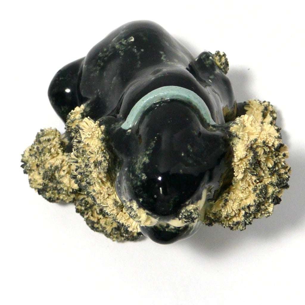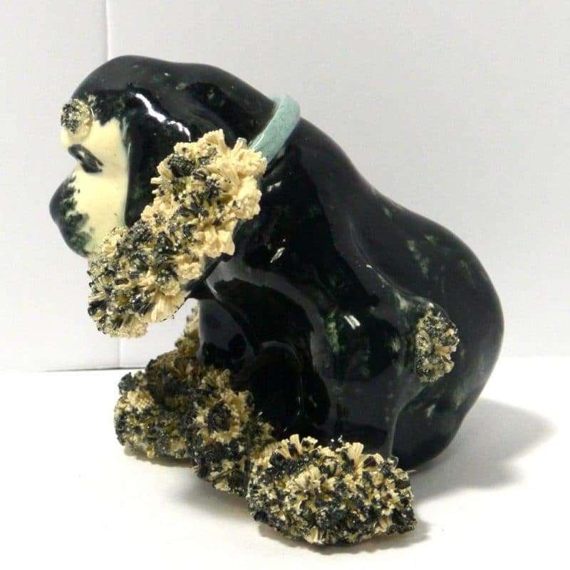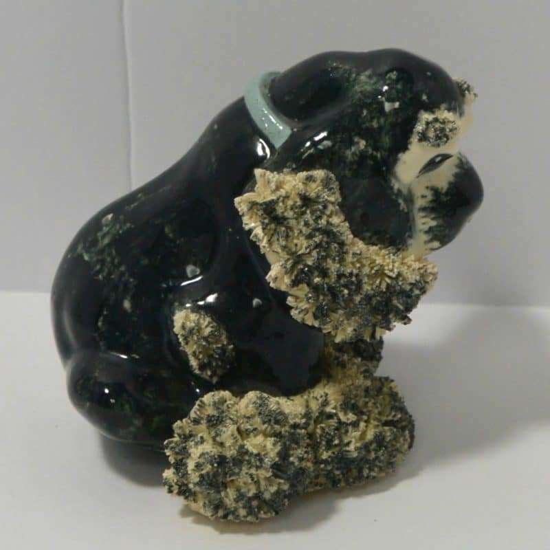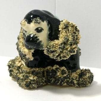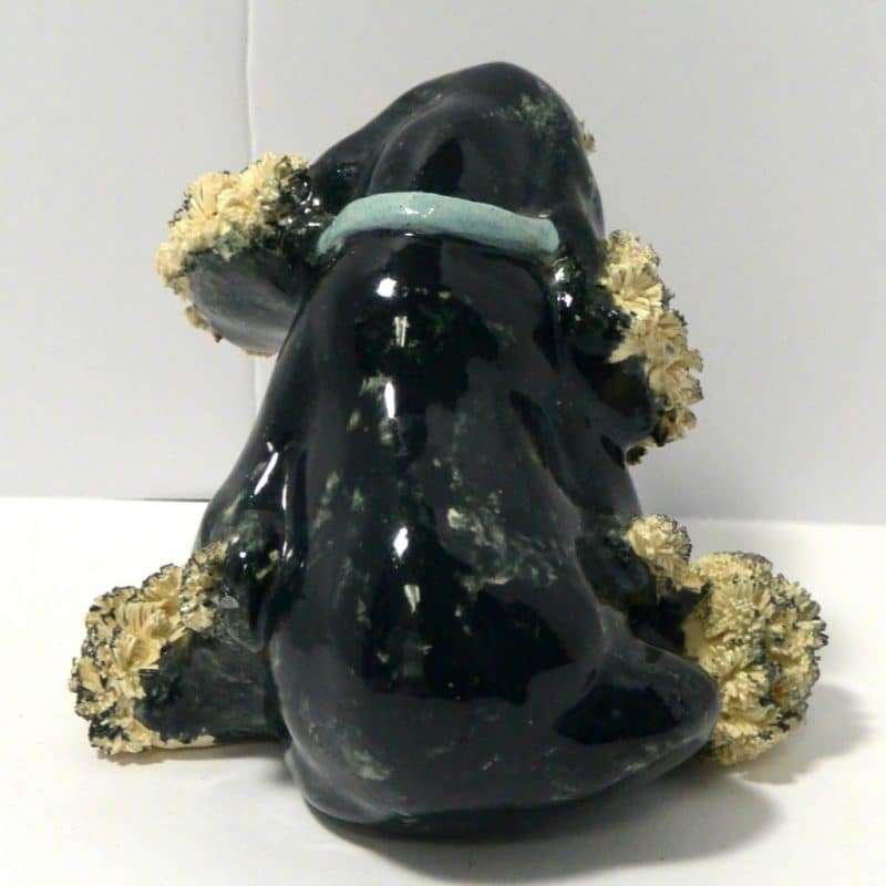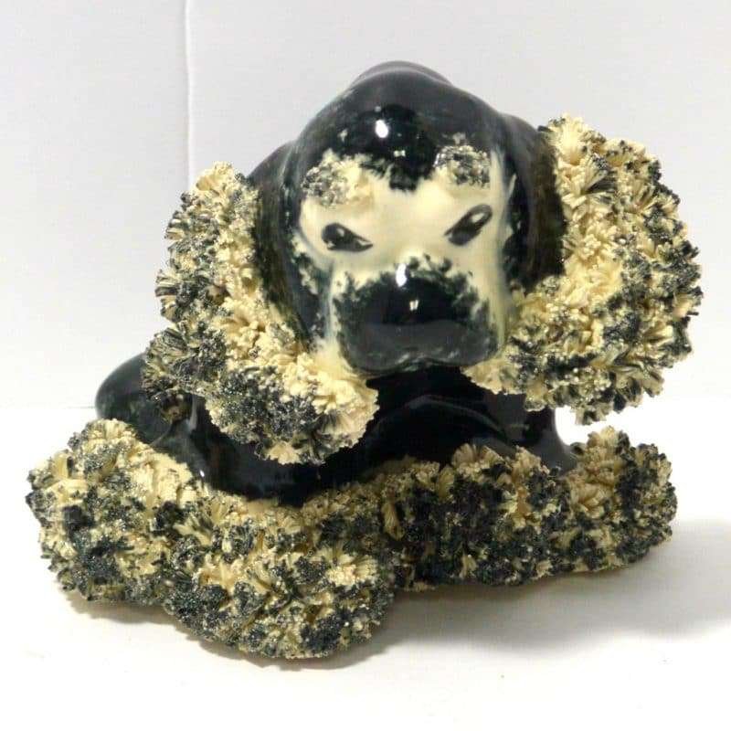 This vintage, black & white, spaghetti Cocker Spaniel looks like the sweetest “chubby puppy.” Since he is sporting a baby blue collar, we will say that “he” measures 4″ tall x 5″ long x 5″ wide. He has a beautiful black body with some swirls of creamy white running through it. He is covered with spaghetti pottery on his ears, above his eyes and on his paws. He is in excellent condition.