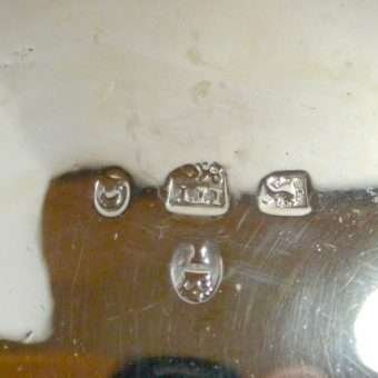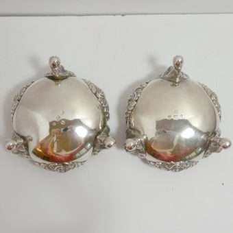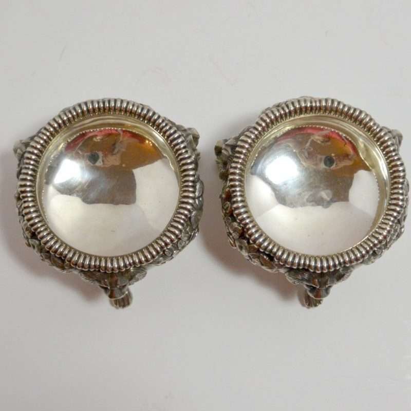 Each of these exquisite, sterling silver open salts feature both ornate floral and leaf designs, as well as three lion’s legs, paws, and heads. Their interiors are sterling and each salt is in outstanding condition. They do not have any monograms, and they have not been repaired or machine polished. This George II lion design was made in 1810, and each piece is well-hallmarked. They are each 2″ tall, with a 3″ diameter. Their age combined with their excellent condition and extraordinary detailing, make this pair truly a treasure worth adding to your British Sterling Silver collection.
