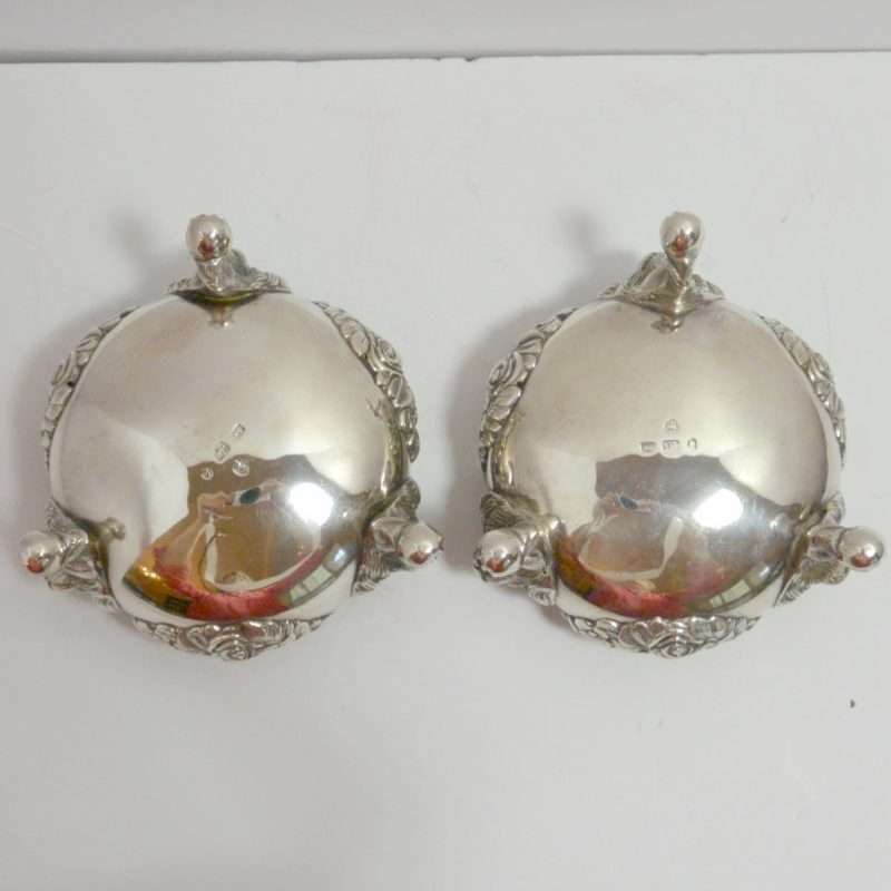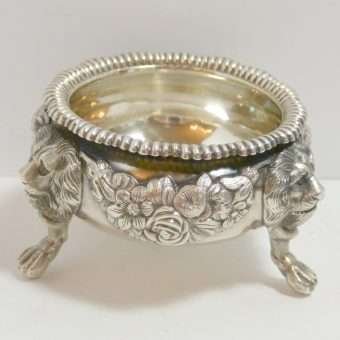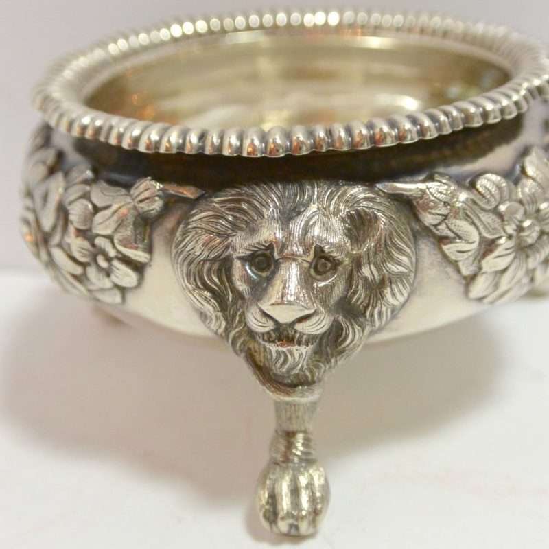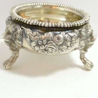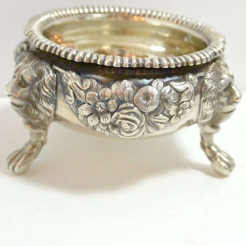 Each of these exquisite, sterling silver open salts feature both ornate floral and leaf designs, as well as three lion’s legs, paws, and heads. Their interiors are sterling and each salt is in outstanding condition.