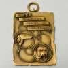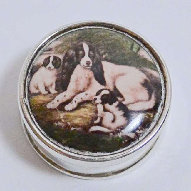 This round, solid sterling pill box features a adult spaniel dog with two puppies on the lid.