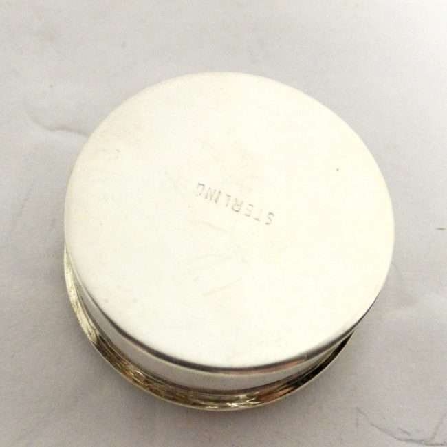 It is marked “STERLING” on the bottom, and it has a hinged lid that opens and closes securely. PLEASE NOTE that the picture of the spaniels is much clearer and brighter than we were able to capture in the photos, and the dark spots on the silver are simply tarnish. The silver is flawless on this box.