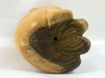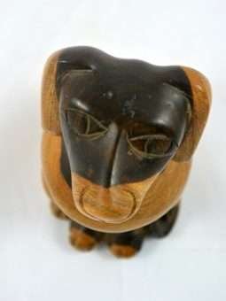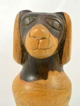 This beautiful, primitive, carved wood dog has simple lines, but shows an extraordinary use of wood. It is carved from Sono Wood, also known by a variety of other names such as East Indian Rosewood, Salabar, Biti or Kalaruk. It is obvious that this particular wood was selected by the artist because it offers both light and dark wood in the same piece. What is so wonderful is how the artist used the different wood tones to simulate the real life look of a Springer Spaniel or other similar breed. It sits 8″ tall x 3 1/2″ long x 3″ wide, and it is very heavy for its size, weighing just under 2lbs. It is a remarkable dog, that would look fabulous in almost any room in your home.