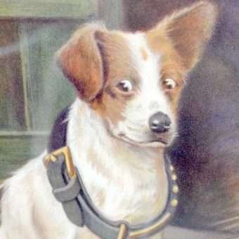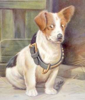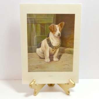 This whimsical, antique print was published in the 1908 edition of the children’s publication “Chatterbox”. Entitled THE MISFIT, it depicts a smiling, bright-eyed, Jack Russell Terrier, wearing a collar that is obviously way too big for him.