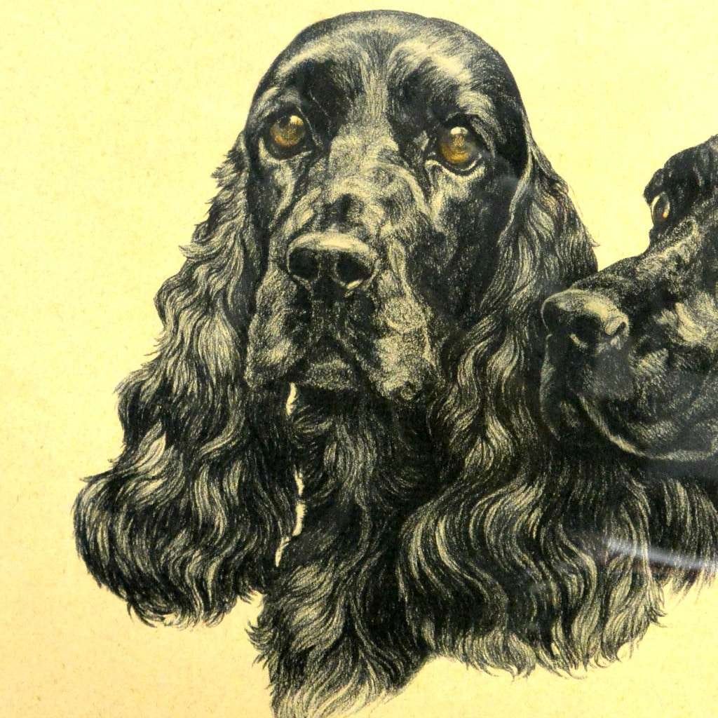 This wonderful portrait shows a matched pair of black English Cocker Spaniels. One is a forward-facing pose and the other shows more of a profile. It is a large portrait, measuring a full 28″ tall x 22″ wide. It looks to be done with charcoal on parchment paper. The detailing is extraordinary. Every strand of curling fur is shown, which gives this pair of elegant dogs a very realistic look.
