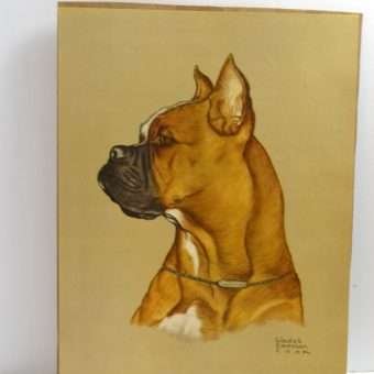 This magnificent Boxer portrait was done by the famous artist, Gladys Emerson Cook (1899-1976.) This artist-signed, vintage print, has the look of pastels and charcoal on paper, done in soft black, deep brown and tan, with touches of white on the dog’s head, neck, chest, and the inside of his ear, and copper in his eyes. The result is a very realistic portrait that makes this Boxer look in character, both deliberate and dignified. The portrait is in excellent condition. It is not matted or framed, and it measures a full 16″ x 12″. It would make a perfect focal point in any canine-themed wall gallery, or a perfect portrait in a den, office, or over a mantel. Of course, it would also make the perfect gift to any lover and owner of this fabulous breed!