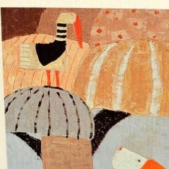 This beautifully colored lithograph is of an abstract painting, depicting a dog and a bird gazing intently at each other from their respective vantage points.