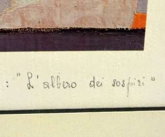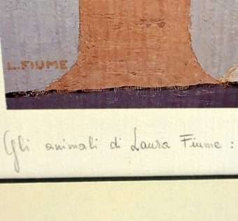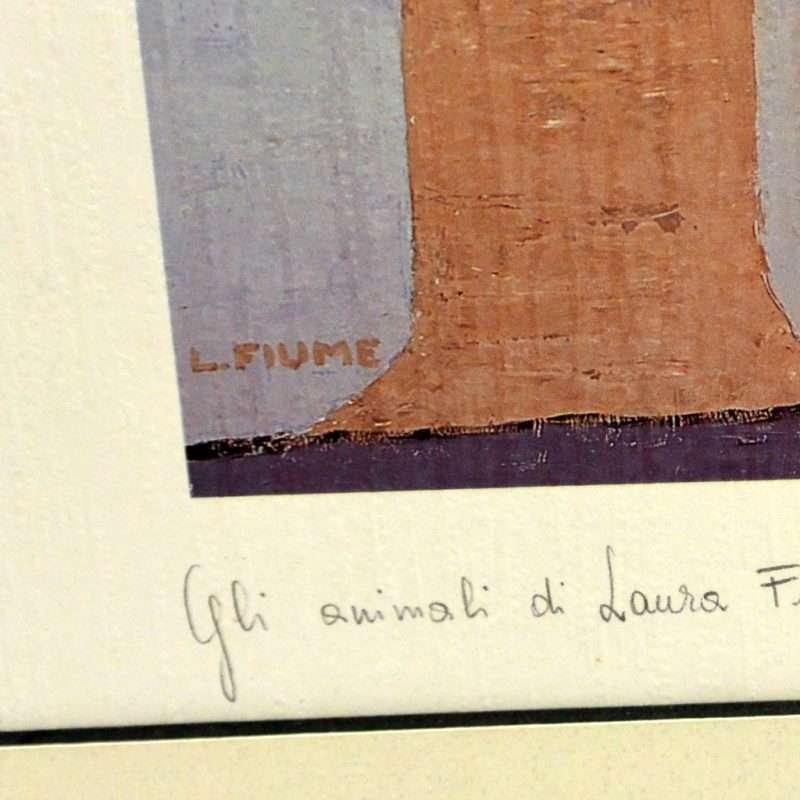 This beautifully colored lithograph is of an abstract painting, depicting a dog and a bird gazing intently at each other from their respective vantage points. The artist, Laura Fiume, is a well-respected Italian artist, whose work has been exhibited around the world and has been featured in children’s books, as well as on textiles, ceramics, and on advertising pieces. She is also the daughter of the famous Italian artist, Salvatore Fiume. This enchanting work of art is pencil titled and pencil signed. It is in excellent condition, and is 11″ x 13″. It is matted, but not framed. Don’t miss this fantastic opportunity to own such a wonderfully expressive work!