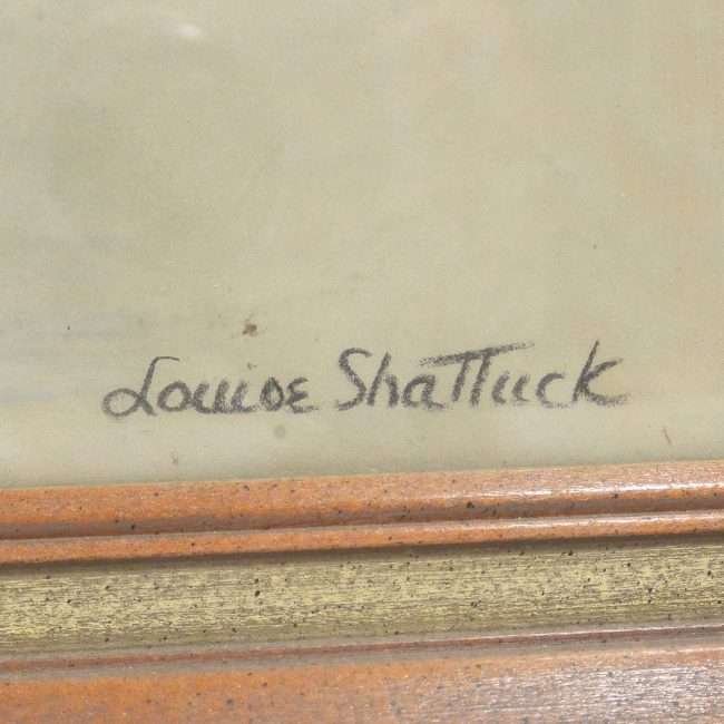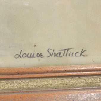It is the work of Louise Shattuck (1881-2005.) Louise Shattuck was a teacher, artist, writer and a breeder of English Cocker Spaniels. She lived most of her life in Lake Pleasant, Massachusetts. She was a well-known animal artist, with dogs being by far, her favorite subject.