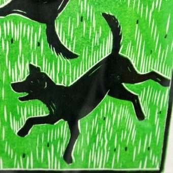 This bright and bold vintage artwork vividly captures the joy and exuberance of a pair of Black Labrador Retrievers frolicking in the wet grass. Entitled “After The Rain”, it is an original, relief print, done in bright green, black and a soft vanilla cream.