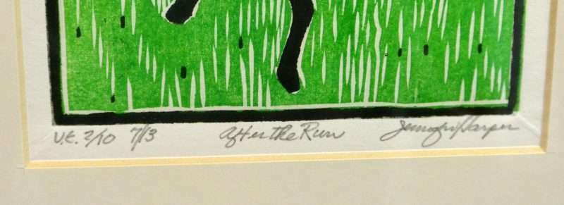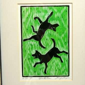 This bright and bold vintage artwork vividly captures the joy and exuberance of a pair of Black Labrador Retrievers frolicking in the wet grass. Entitled “After The Rain”, it is an original, relief print, done in bright green, black and a soft vanilla cream. It is framed under glass in a painted wood frame, it measures 12″ tall x 10″ wide, and it is signed by the American artist, Jennifer Harper, in the 1970’s. It is in mint condition. If you are an owner of a Black Labrador Retriever dog, this wonderful, whimsical work of art can’t help but make you smile!