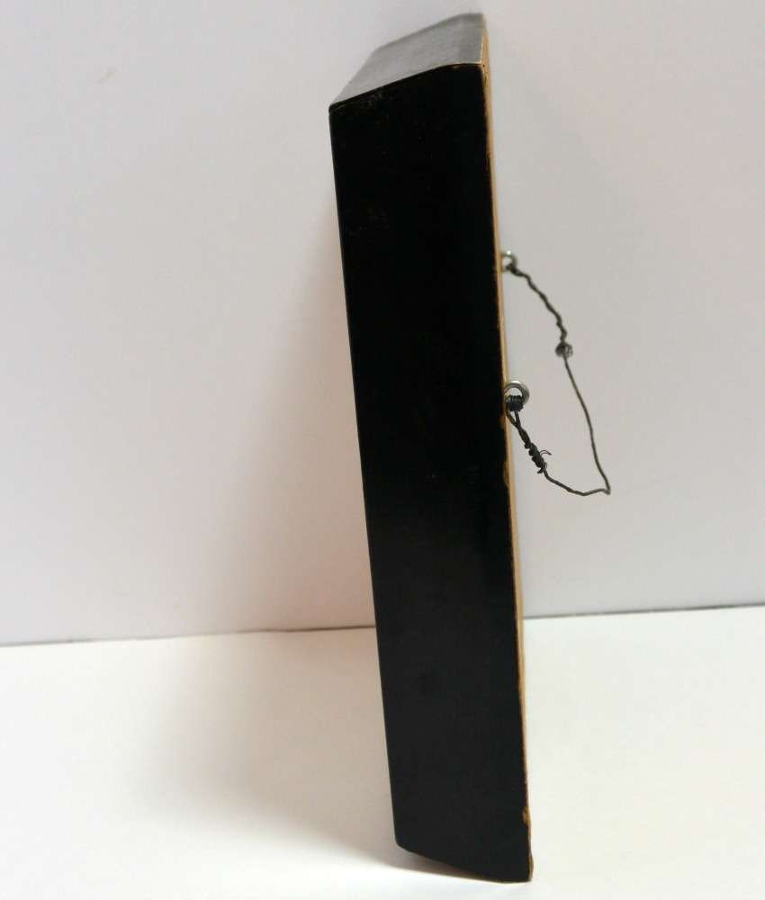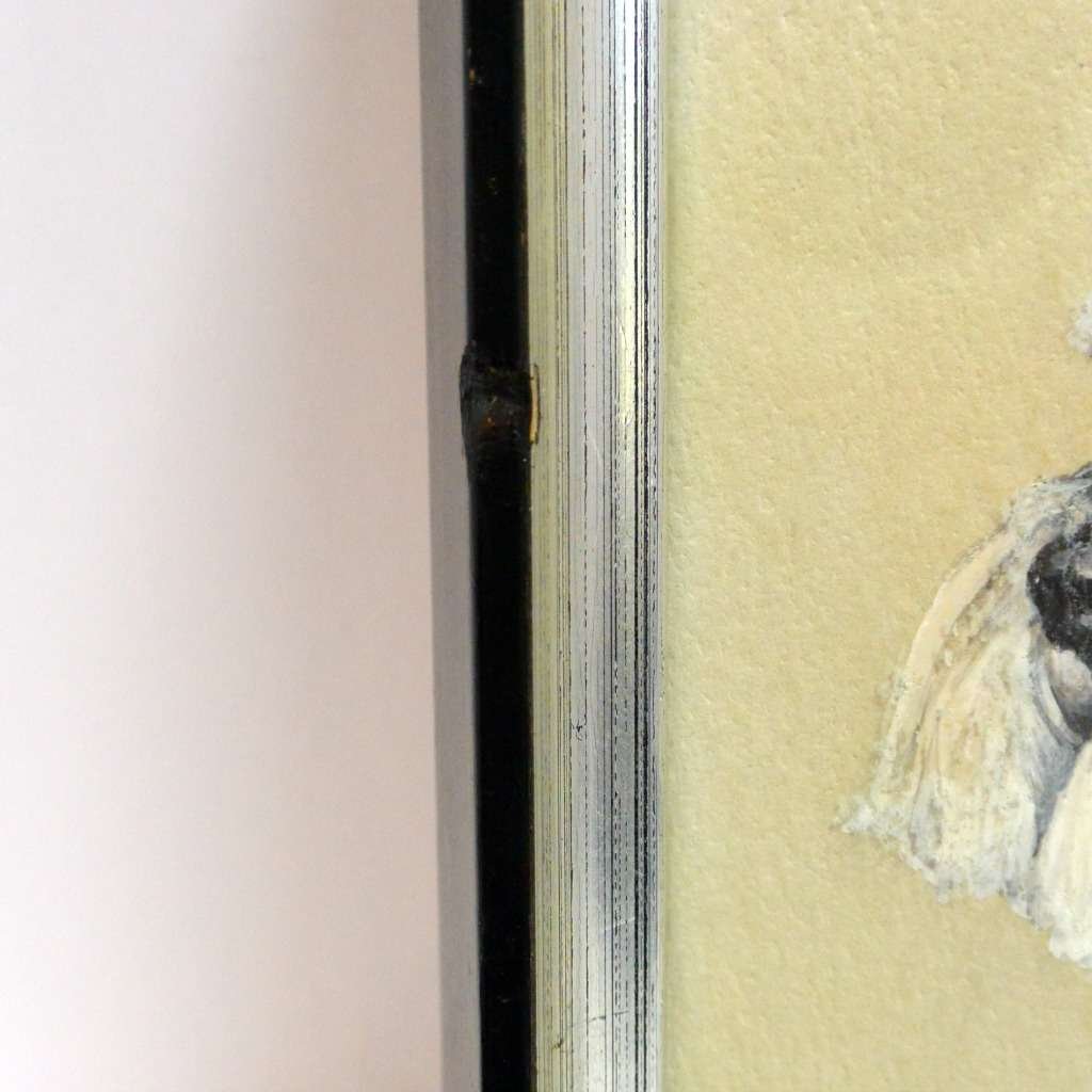 The artwork is in excellent condition. It is framed in it’s original wooden frame, under glass. The total piece measures 8″ tall x 6″ long x 1 1/4″ deep. The frame has a small nick on it that was painted over, and therefore difficult to see. The frame is painted black with silver paint along the inside.