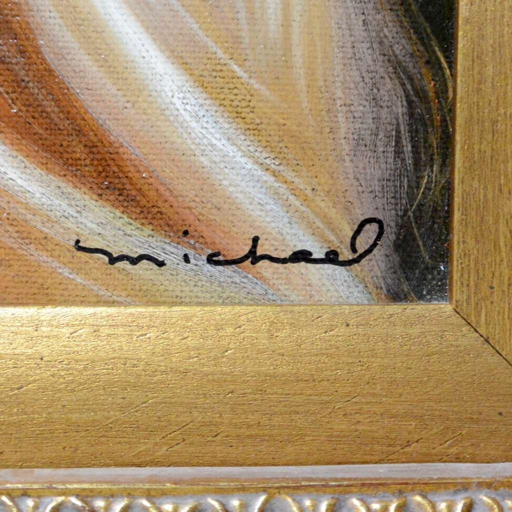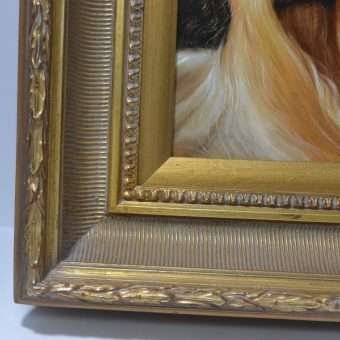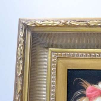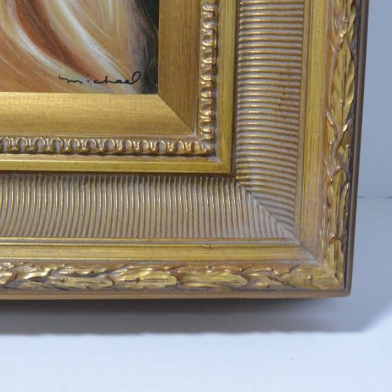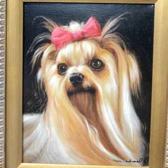 This magnificent painted portrait of a Yorkshire Terrier dog captures both her delicate appearance and her bold spirit. Exquisitely detailed and expertly realistic, you feel as though you have certainly met her before. To add to the beauty of this canine art, she is framed in a very heavy, solid wood, gilded frame that is 16″ x 18″ and 2 3/4″ thick. The entire piece is in mint condition, and it is signed by the artist.