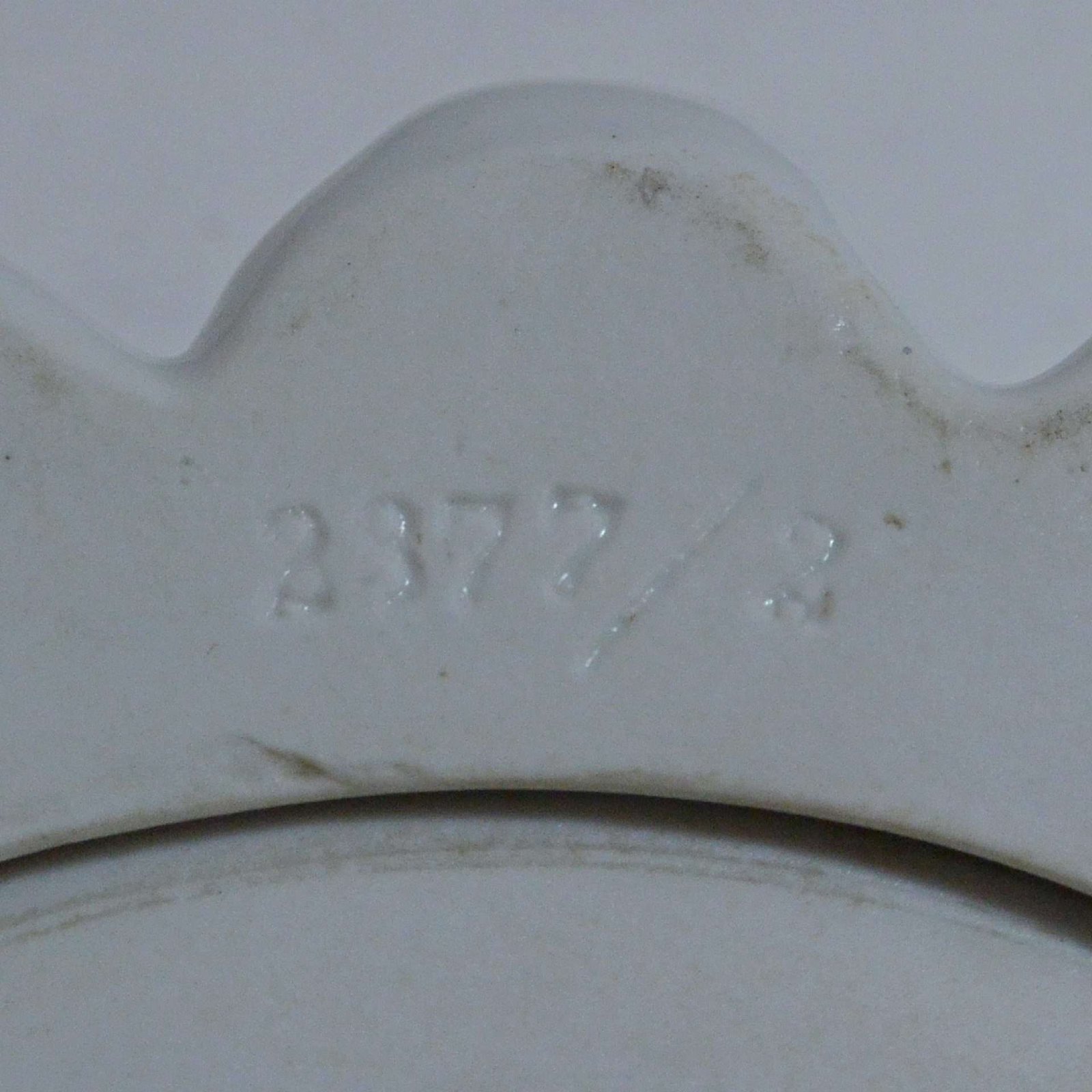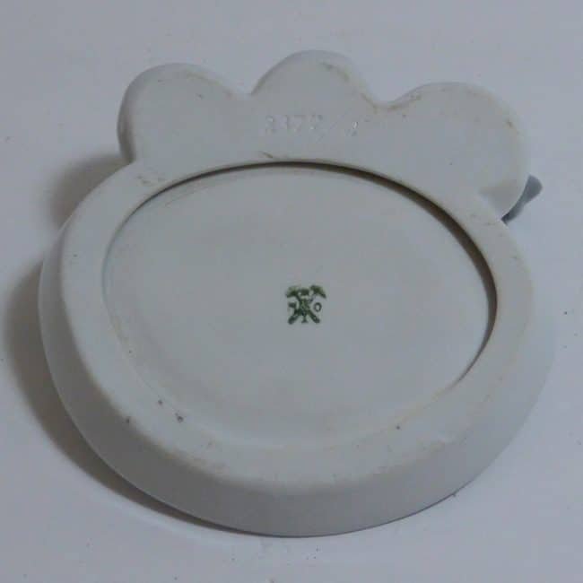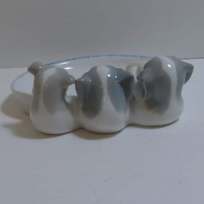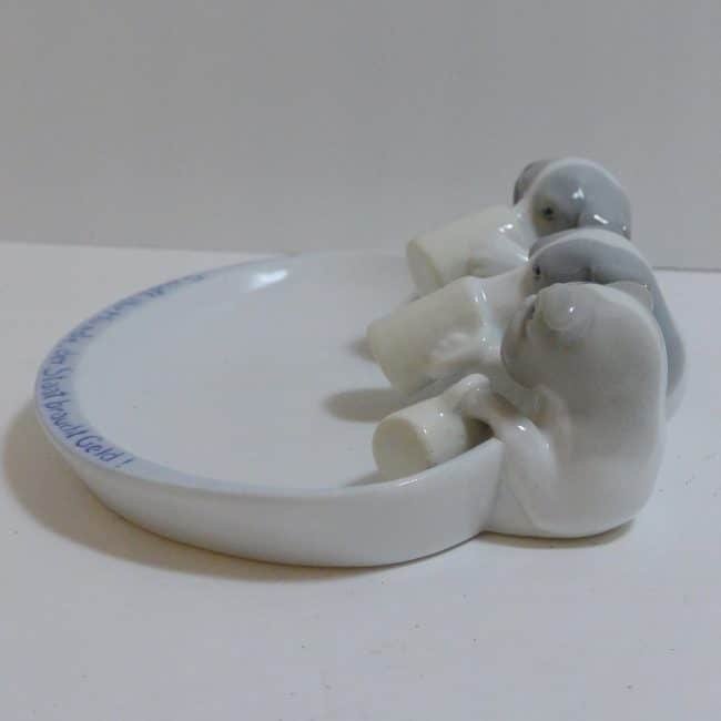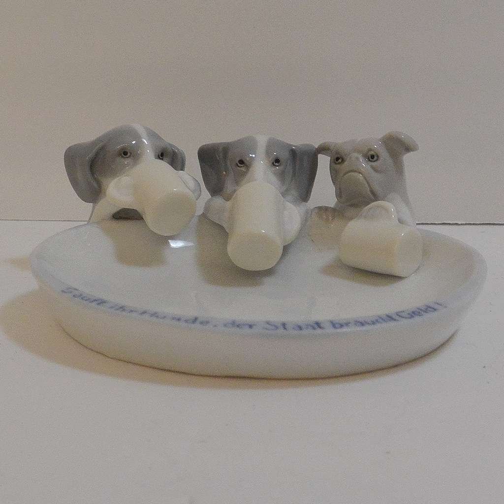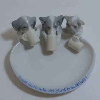 This fantastic porcelain penny plate is almost too wonderful for words. It was made by Metzler & Ortloff in Germany in the early 1900’s, and features three dogs, holding beer mugs.
