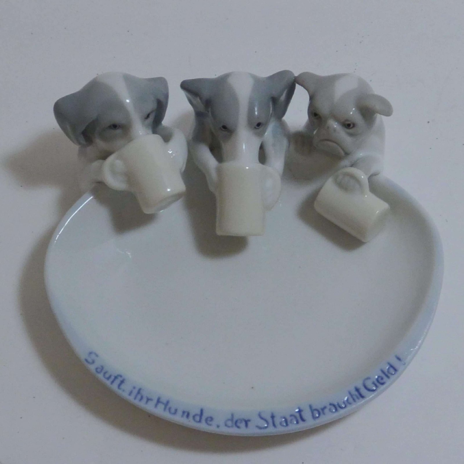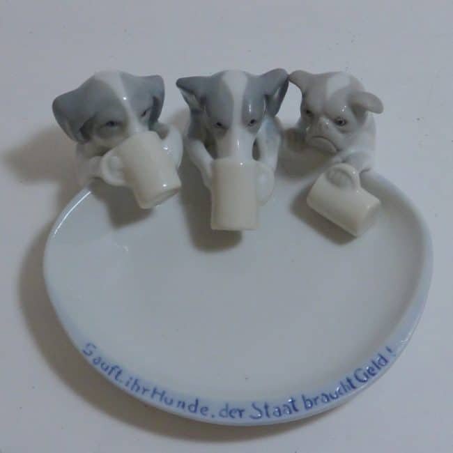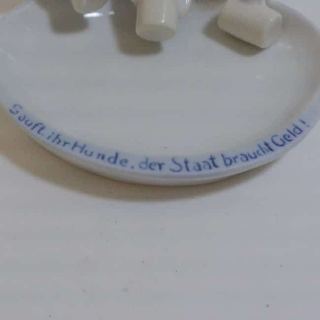 Along the front edge of the plate it says in German, “Drink up you dogs, the state needs money!”