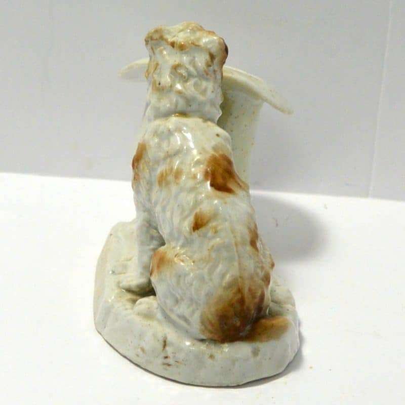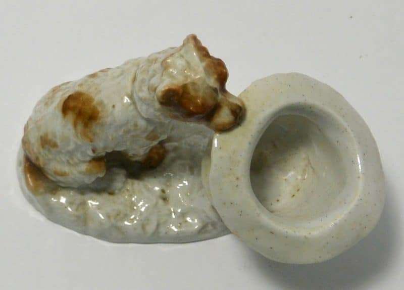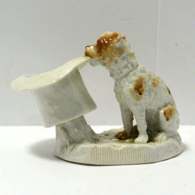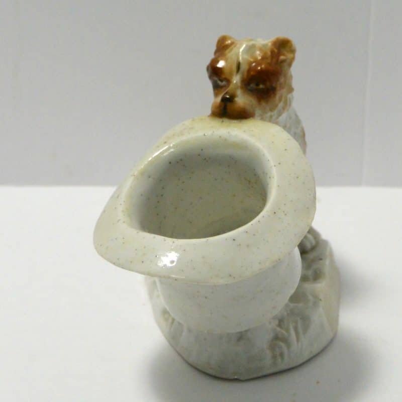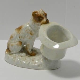 This wonderful, Dresden porcelain match holder/striker was made in Germany and designed in the form of a sweet Terrier dog, dutifully holding on to a top hat.