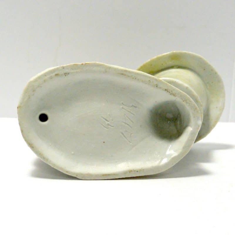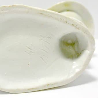 This wonderful, Dresden porcelain match holder/striker was made in Germany and designed in the form of a sweet Terrier dog, dutifully holding on to a top hat. The interior of the hat was used to hold matchsticks, and there is a ridged strip along the side of the base that was used as a striker for the matchsticks. Measuring 3 3/4″ tall x 5 1/4″ long x 2 1/2″ wide, this unique porcelain match holder/striker is in excellent condition. The maker’s mark is incised on the underside of the base, but it is indistinguishable. Aside from being so charming, this sweet dog’s top hat can be used to hold a variety of desktop items. It is the perfect size to hold a roll of stamps!