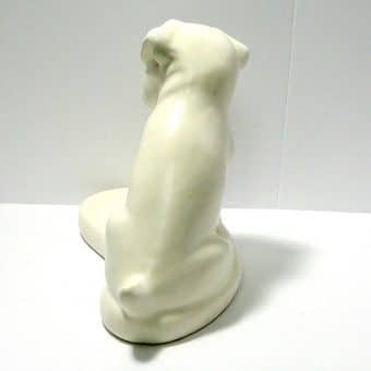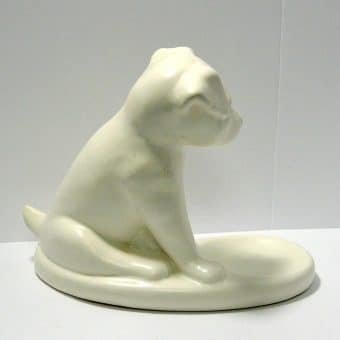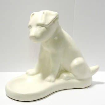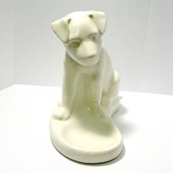 This Royal Haeger puppy dog is sitting and positioned to be gazing into a fish bowl. The entire piece is a full 9″ tall x 11 1/2″ long x 6″ wide, and it is in excellent condition.
