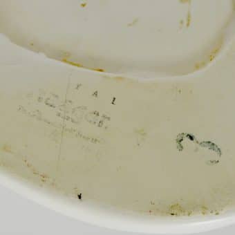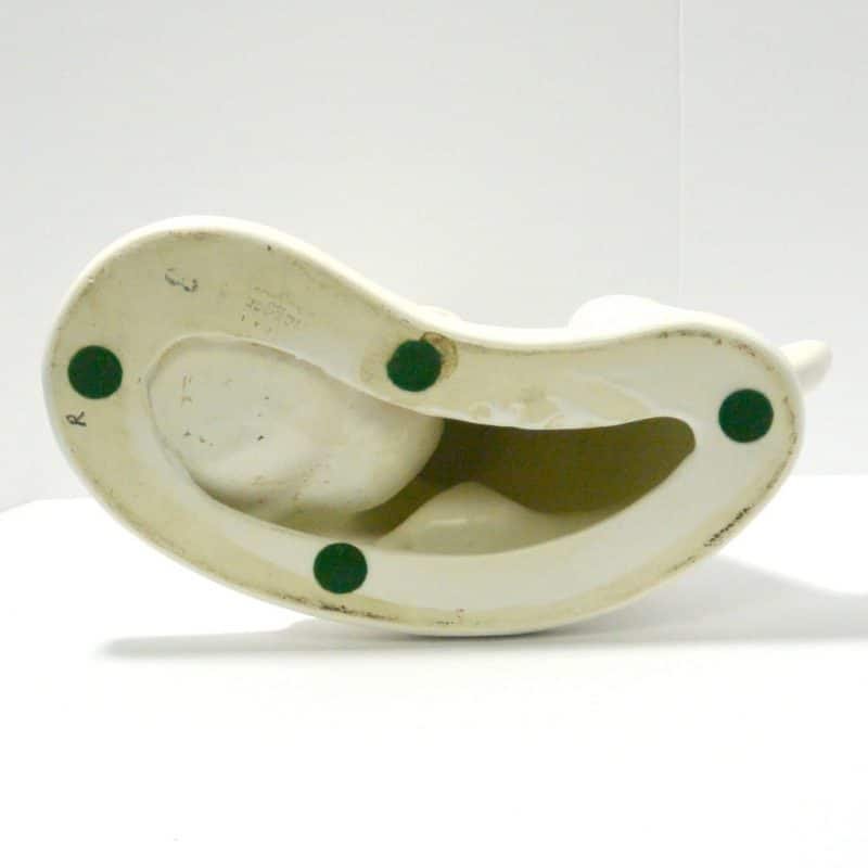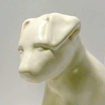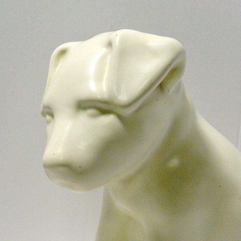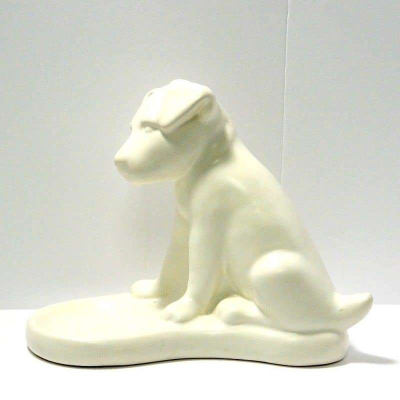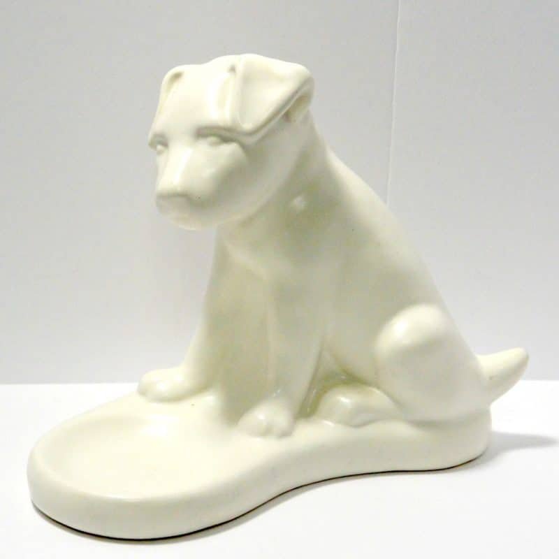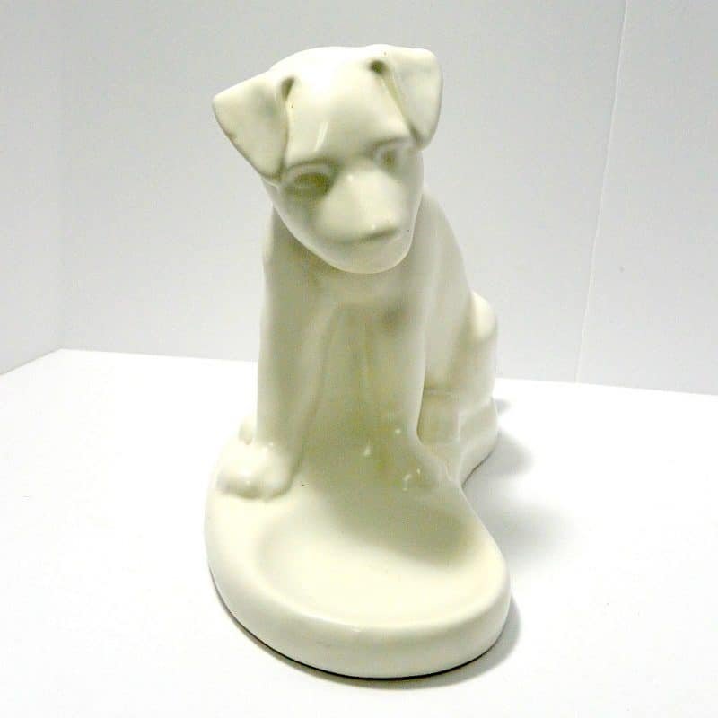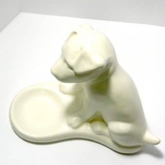 This Royal Haeger puppy dog is sitting and positioned to be gazing into a fish bowl. The entire piece is a full 9″ tall x 11 1/2″ long x 6″ wide, and it is in excellent condition. The original bowl is missing, but it can easily be replaced by a 4″ x 4″ bowl, or a candy/trinket dish, that would rest in the slight depression that is made into the base. It would also look gorgeous if you were to use a clear glass bowl with a single flower inside. The puppy has some wonderful detailing. Just look at the realistic fold of his ears. He would make a wonderful centerpiece, a delightful decorative addition, or even a unique way to keep your puppy’s treats up on your kitchen counter.