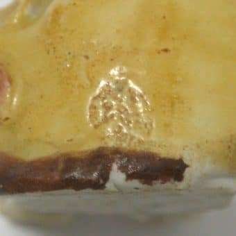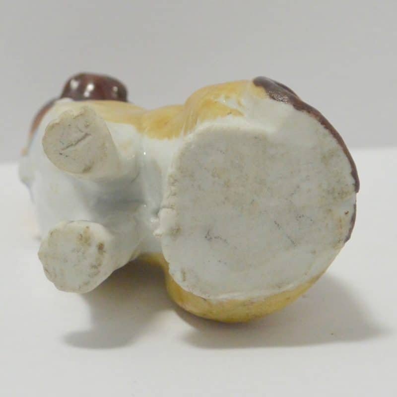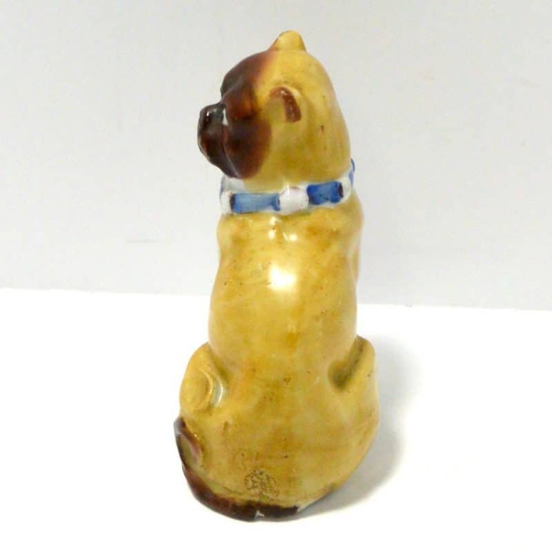 Harder to find and highly collectible, this Pug measures 4 1/4″ tall x 2 3/4″ long x 1 5/8″ wide. He is in excellent condition with an impressed mark at the base of is tail. He was made in Germany, during the late 19th century.