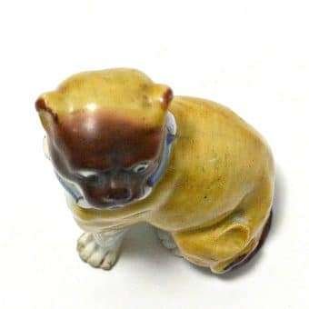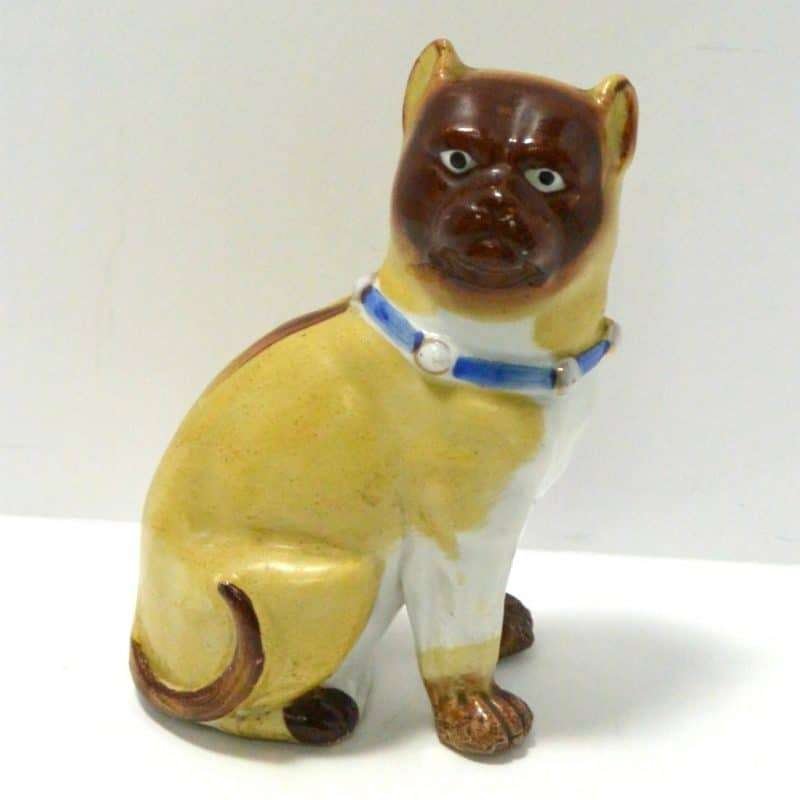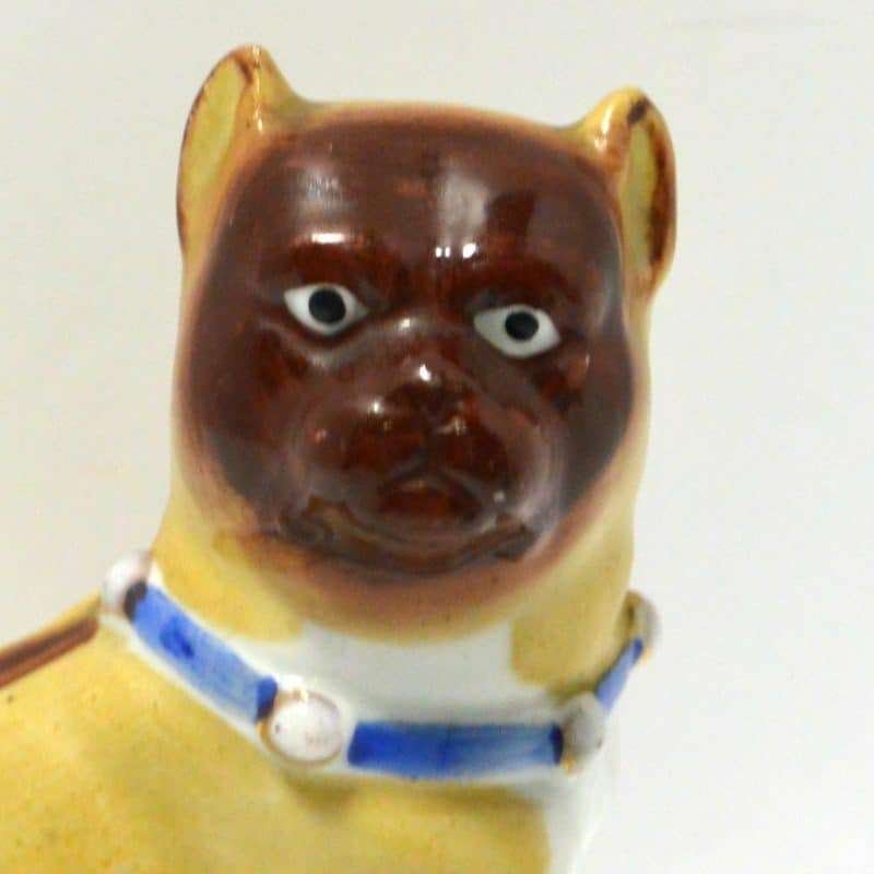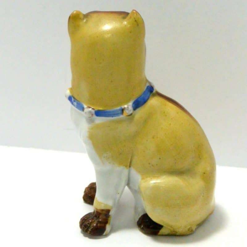 This antique, porcelain Pug dog is seated with open front legs. He is wearing a bright blue, ribbon collar with bells. He is a beautiful fawn color with white and dark brown accents. Referred to as a “Cat Face” Pug, he also has a loosely curled “cat-like” tail, unlike the typically, tightly curled tail on other Pug porcelain figurines.