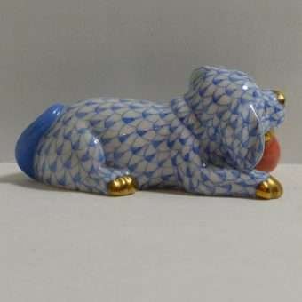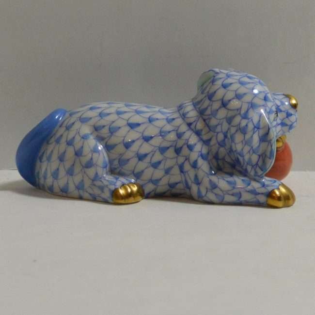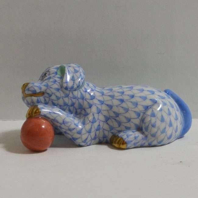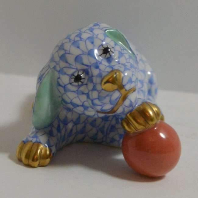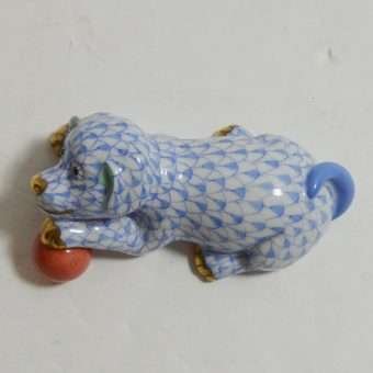 This elegant, fishnet, puppy dog is playing with a ball. This sweet pup is done in a beautiful “baby blue” and white, with 24K gold accents.