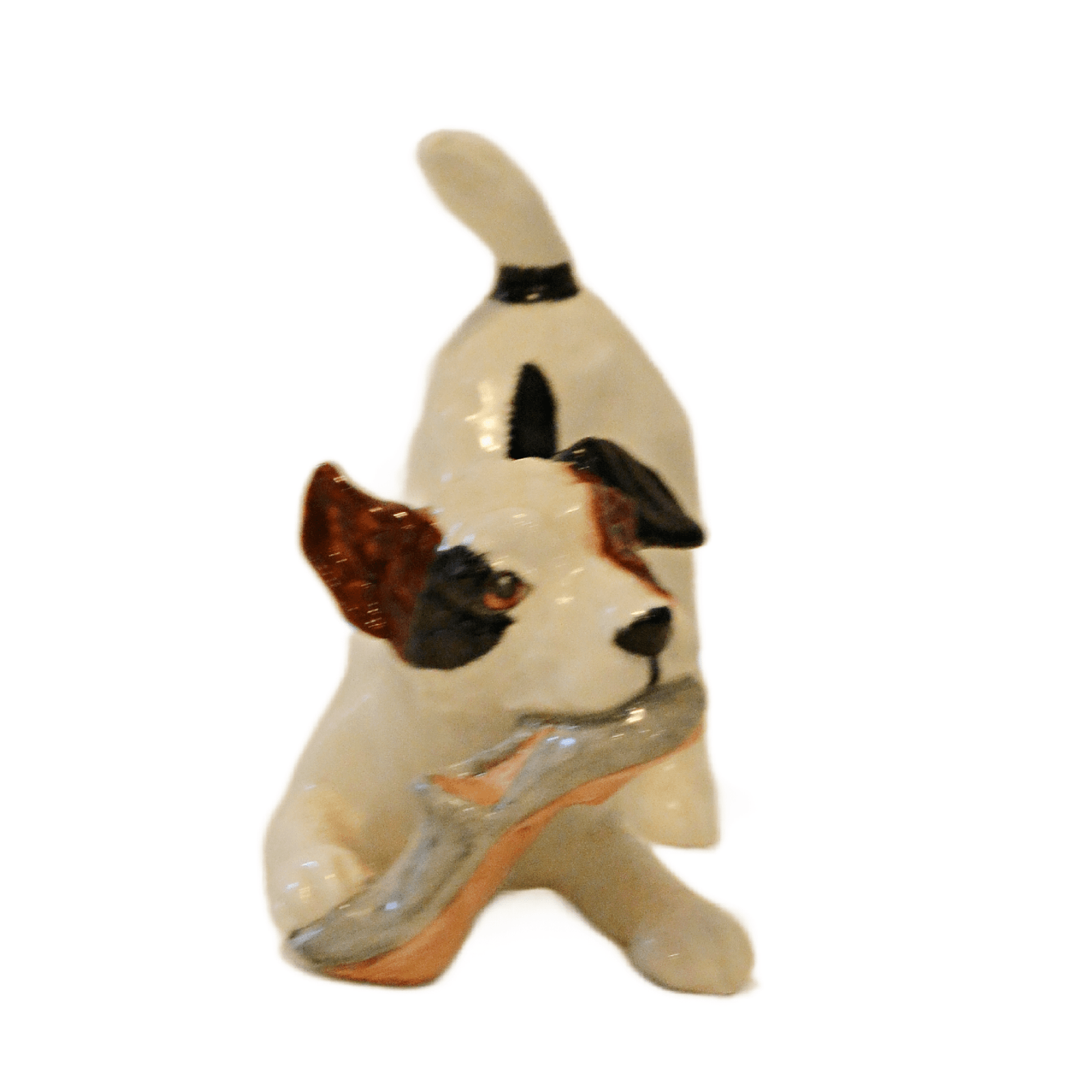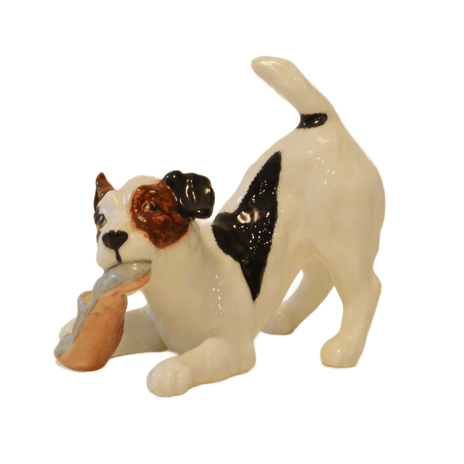This whimsical Jack Russell dog has pounced on a slipper and is having a grand time with it!