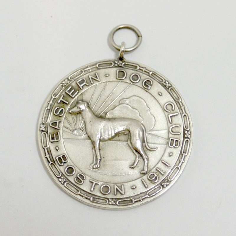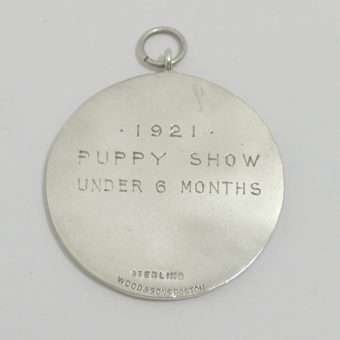 The front edges of this medal are decorated in a finely detailed chain link design. Below that it says “Eastern Dog Club Boston 1911.” On the back, it reads : 1921 Puppy Show Under 6 Months.