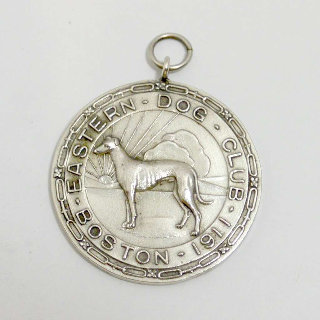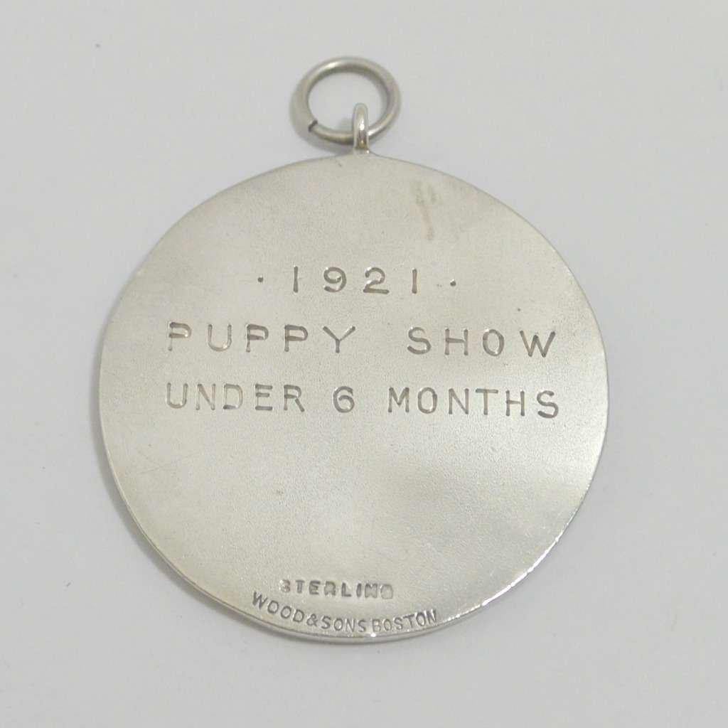 The front edges of this medal are decorated in a finely detailed chain link design. Below that it says “Eastern Dog Club Boston 1911.” On the back, it reads : 1921 Puppy Show Under 6 Months.