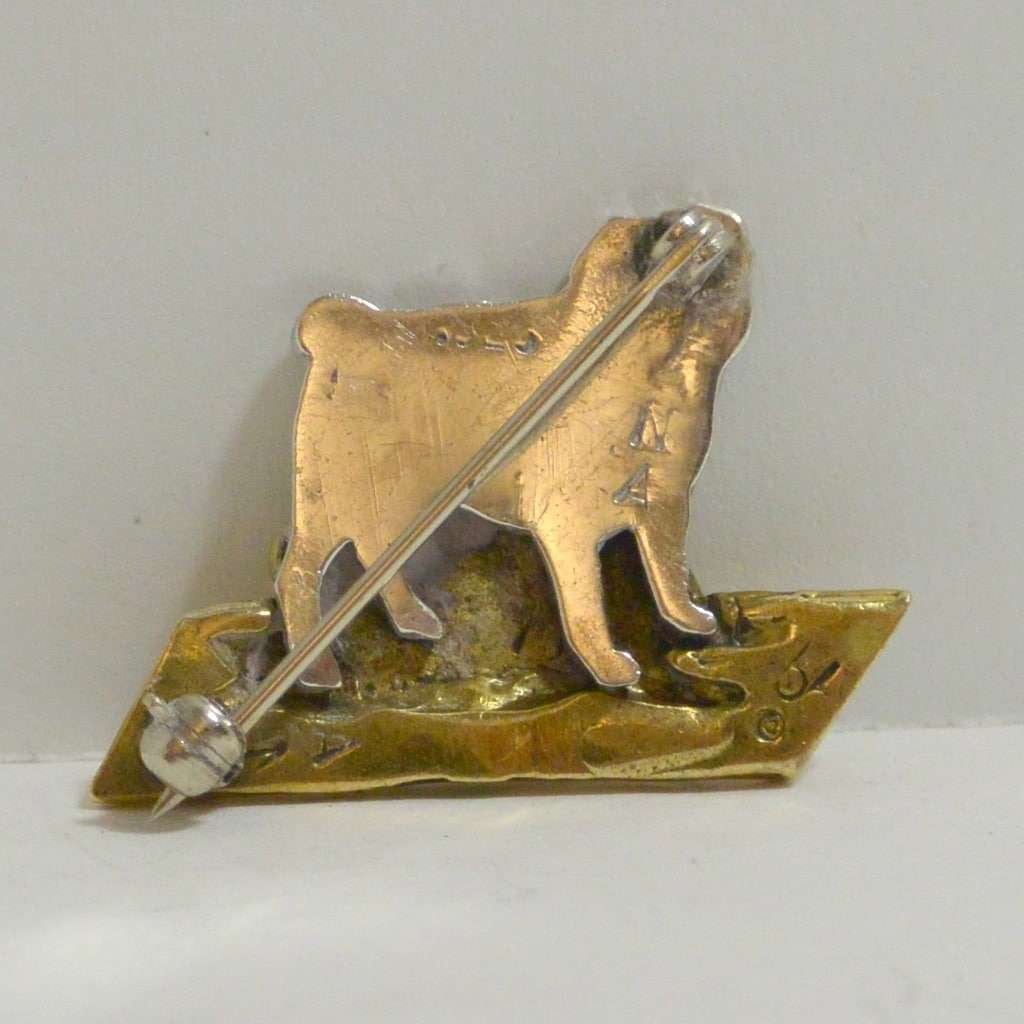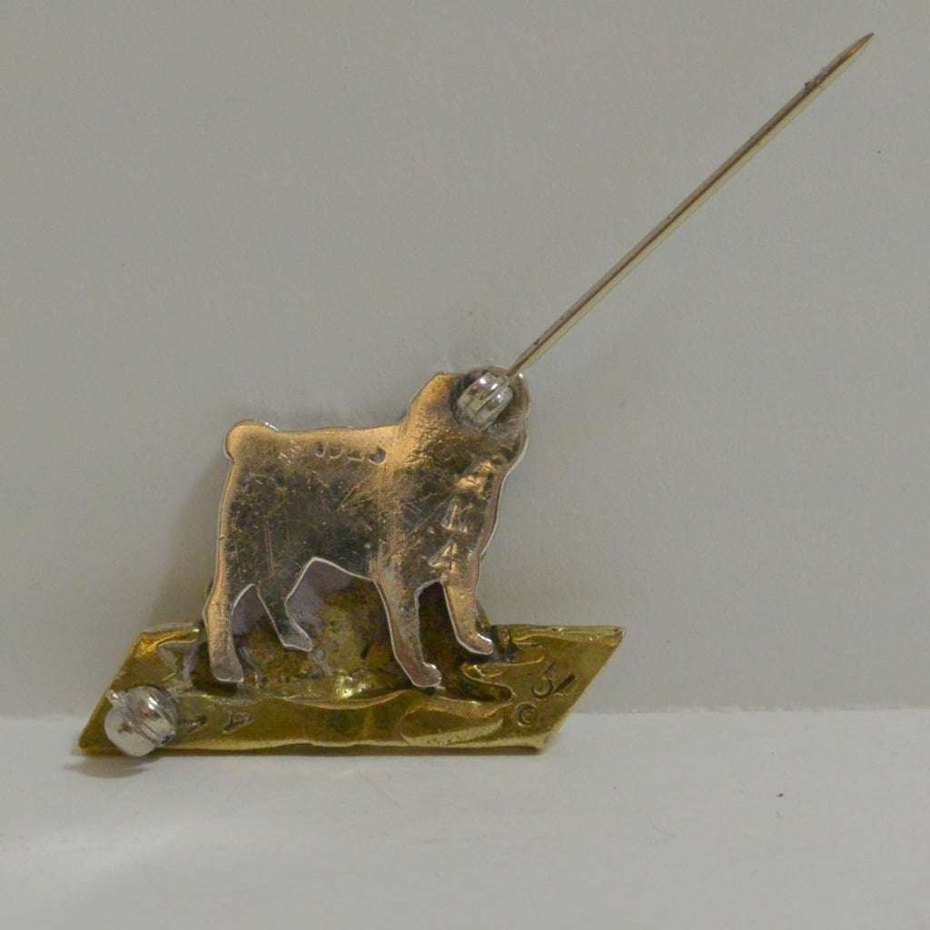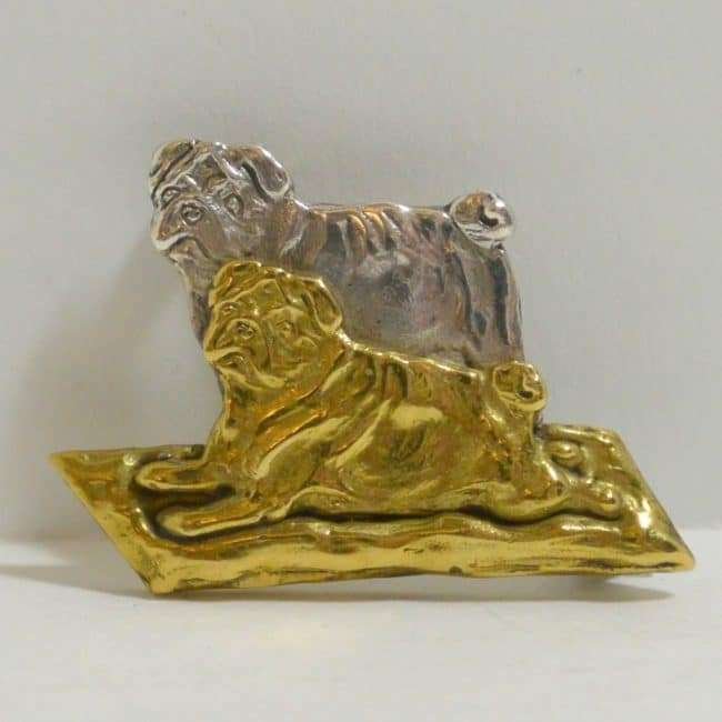 This sweet pair of Pugs look to be the very best of friends. This vintage pin has a sterling silver Pug lying next to a Pug that is done in a gold tone metal. Together they look fabulous.