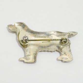 This sterling silver Spaniel dog pin is both simple and sweet. The extraordinary detailing of the dog’s flowing fur and gorgeous ear makes it a truly exquisite piece to wear both informally on a shirt or sweater, or even as a more formal piece on a dress or dressy blouse.